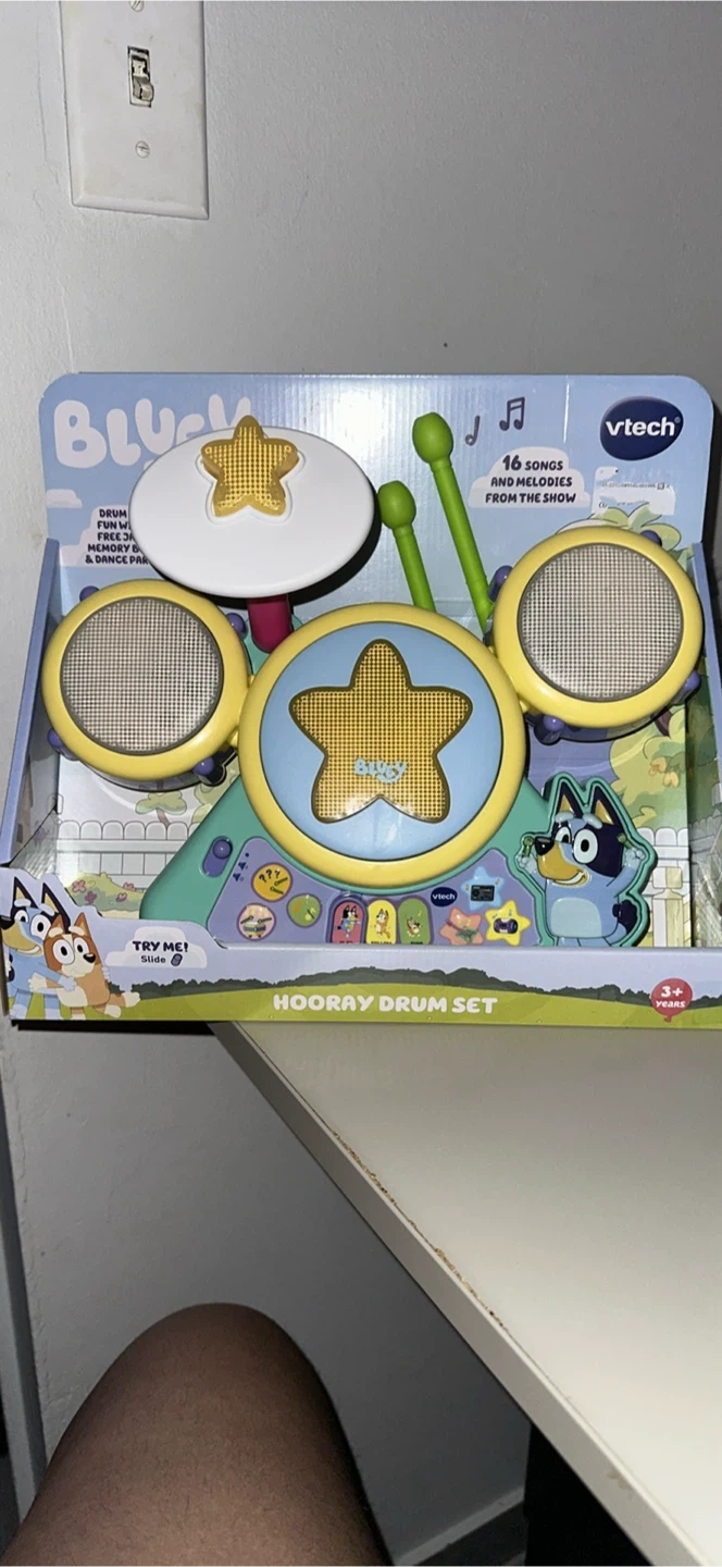 I have a VTech Bluey Hooray Drum Set for sale! It features 16 songs and melodies from the show. This drum set is recommended for ages 3 and up! It encourages free jam sessions, memory building, and dance parties!