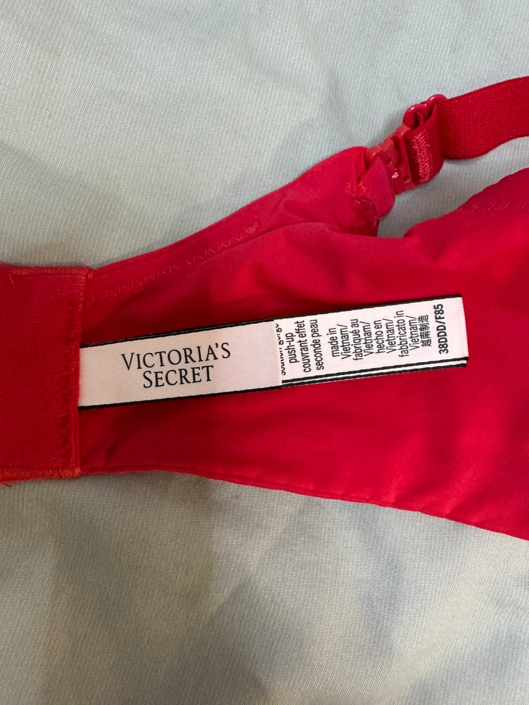 Selling a red Victoria's Secret bra in size 38DDD/F85. It's a push-up style and made in Vietnam. Feel free to message me with any questions!