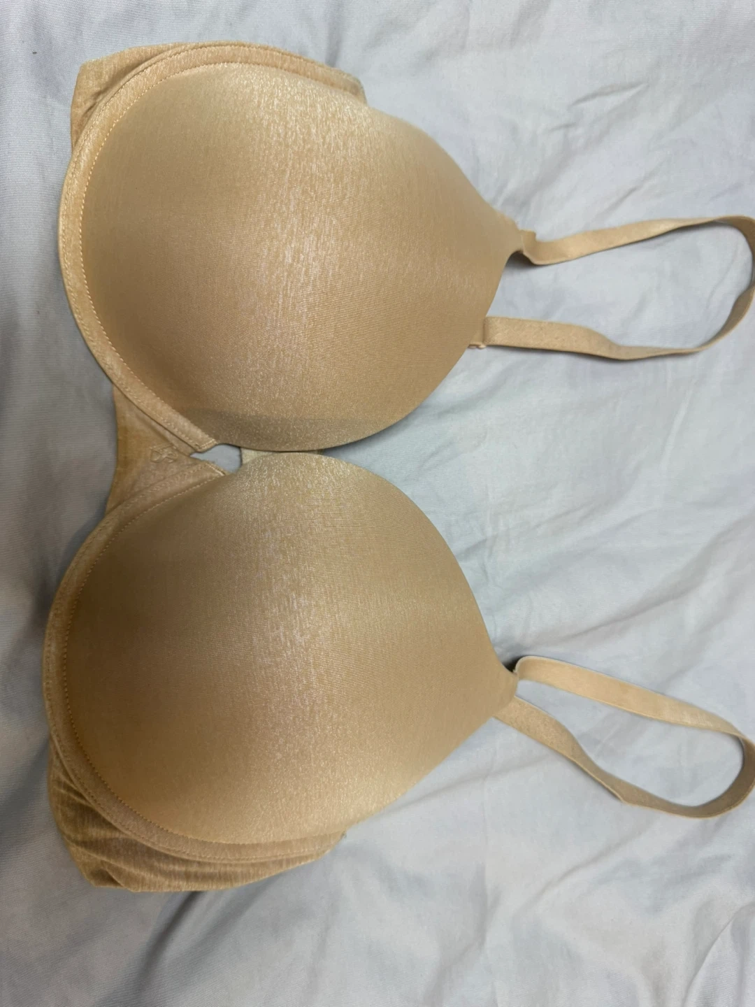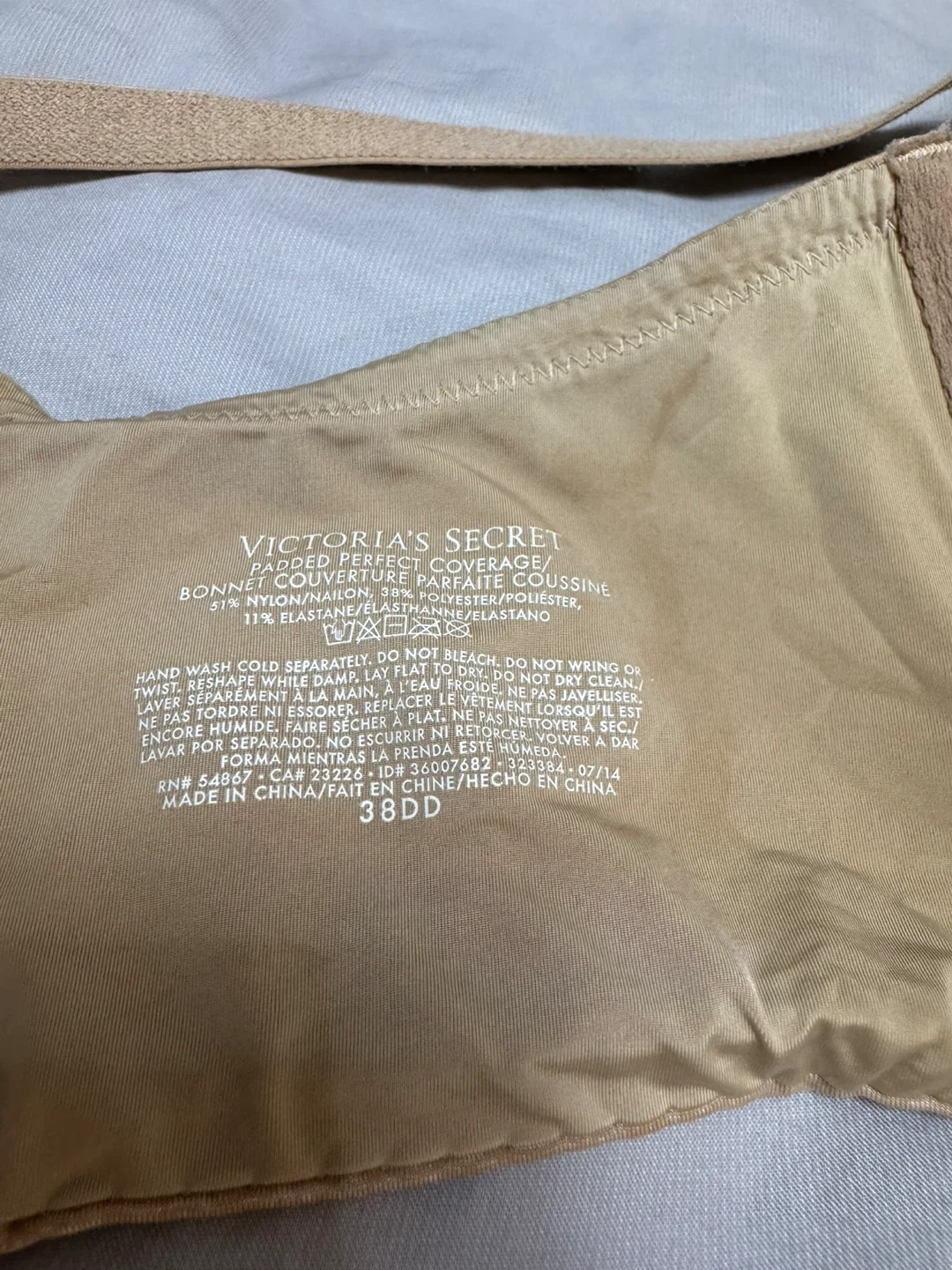 Selling a Victoria's Secret Padded Perfect Coverage Bra in size 38DD. It's made of 61% nylon/nailon, 38% polyester/poliéster, and 11% elastane/elastano