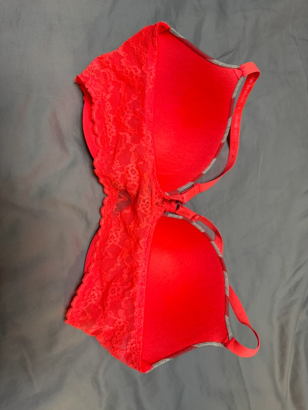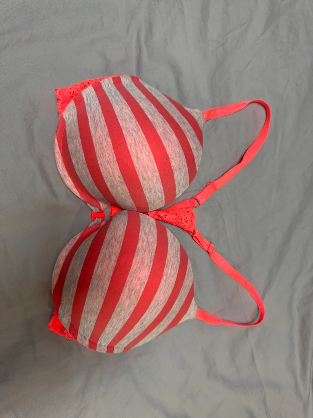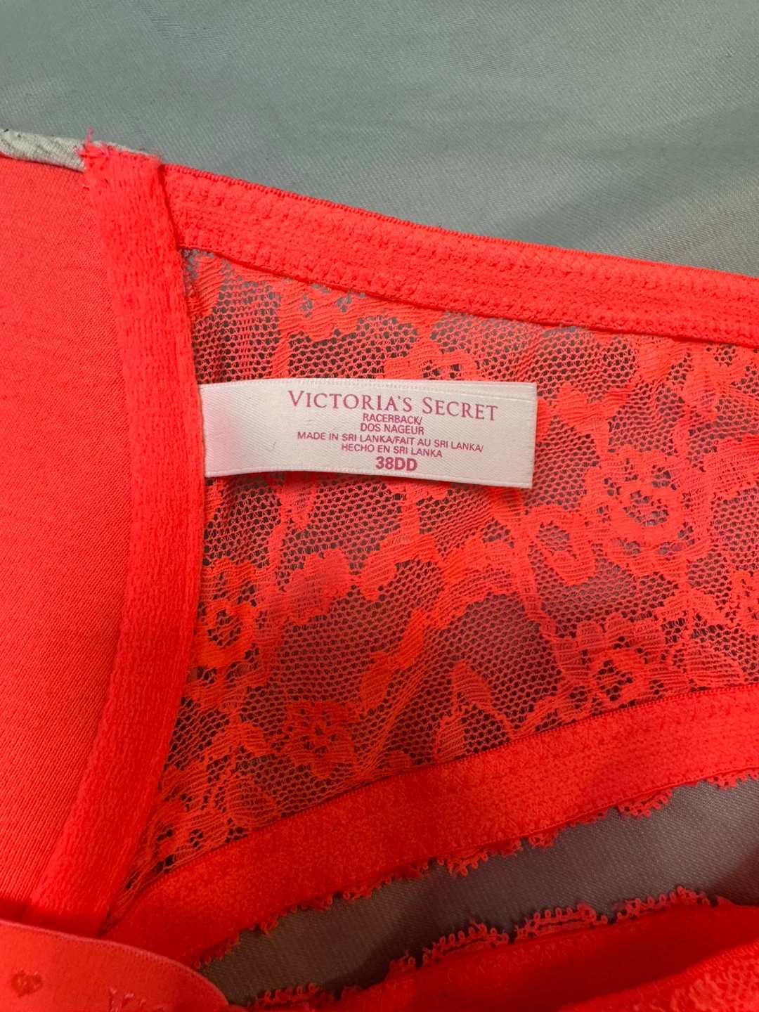 Victoria's Secret racerback bra in size 38DD. It features a vibrant pink and grey striped pattern on the cups and intricate lace detailing on the back. Perfect for everyday wear!