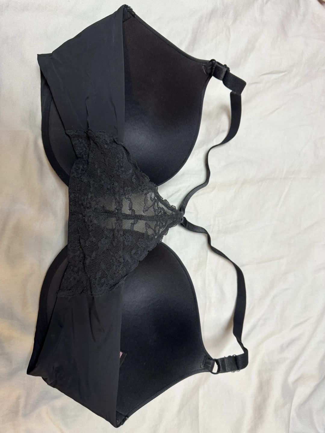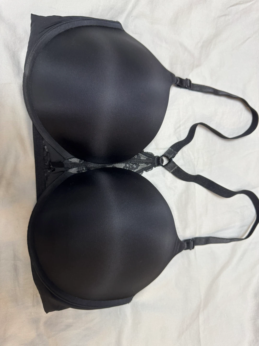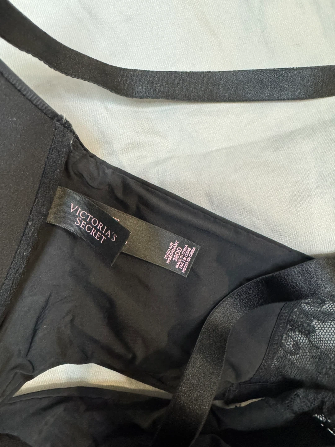 Selling a Victoria's Secret push-up racer-back bra in size 38DD. It's a pretty black color and in great condition!