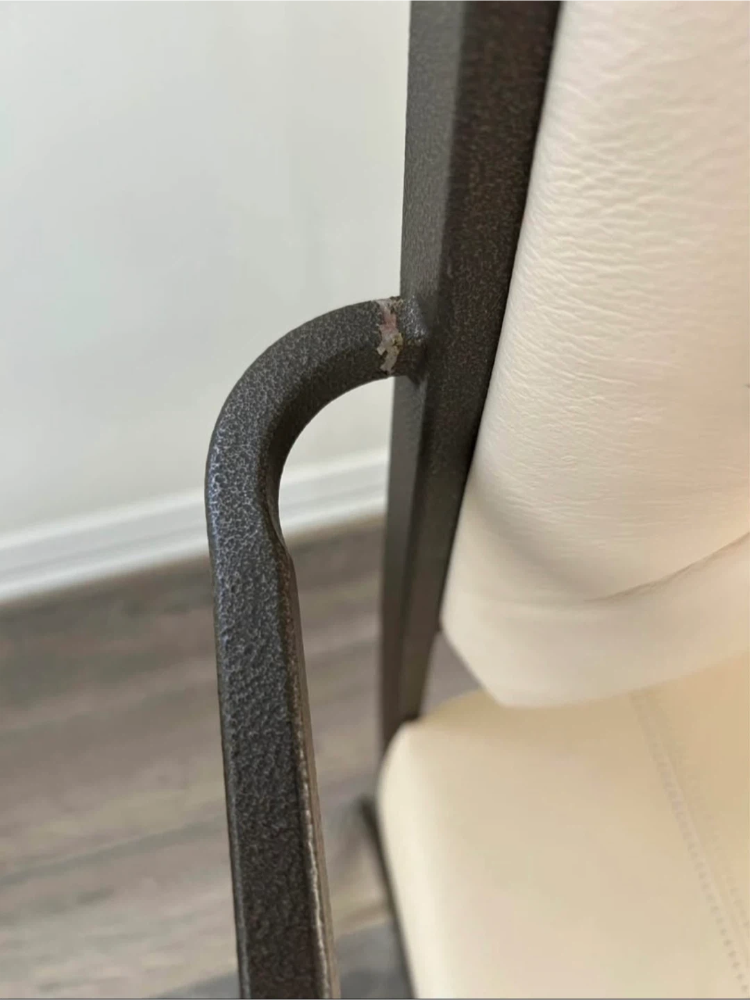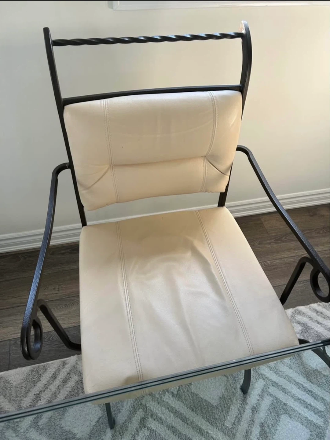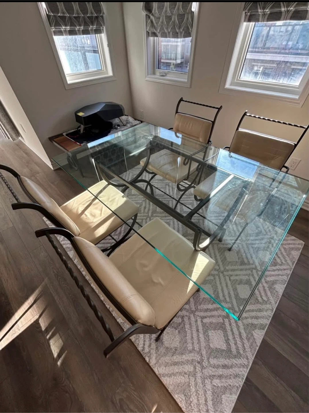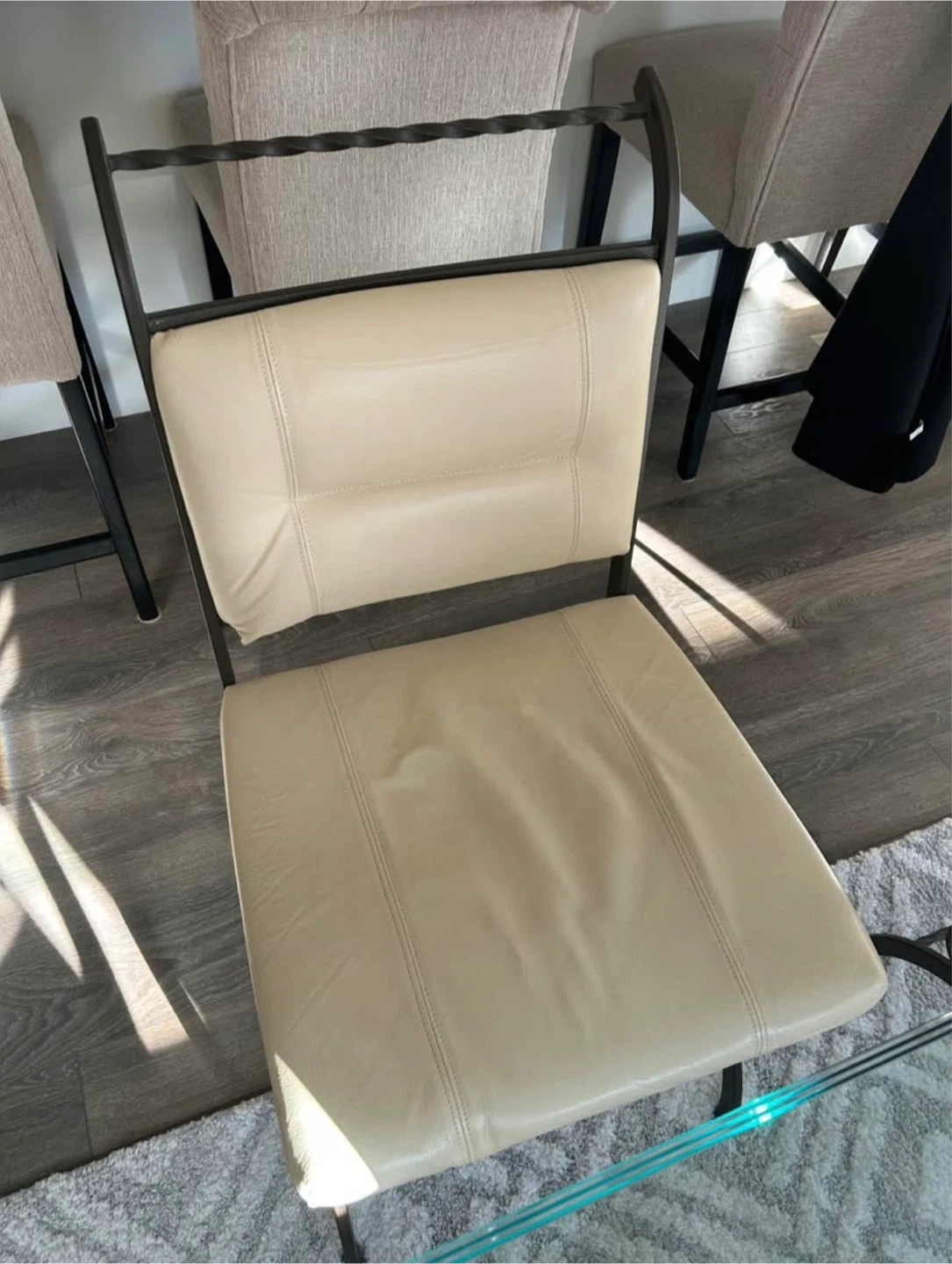 Selling a dining table with a glass top and four chairs. The chairs have a metal frame and a cream-coloured seat. There are some signs of wear on the chairs, as shown in the pictures, specifically with one chair. Great set though.