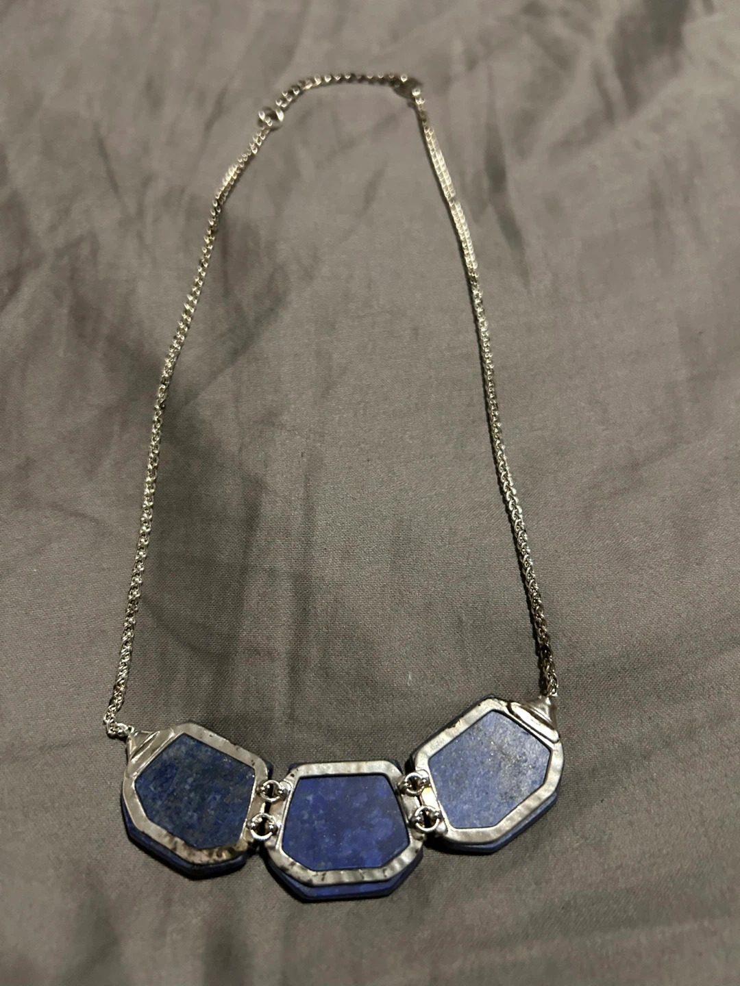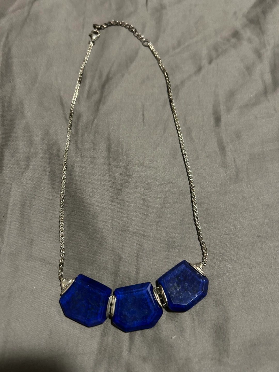 A stylish necklace featuring three striking blue stones. The chain is silver-toned, making it a versatile piece to complement any outfit. It's in excellent condition and ready for a new home!