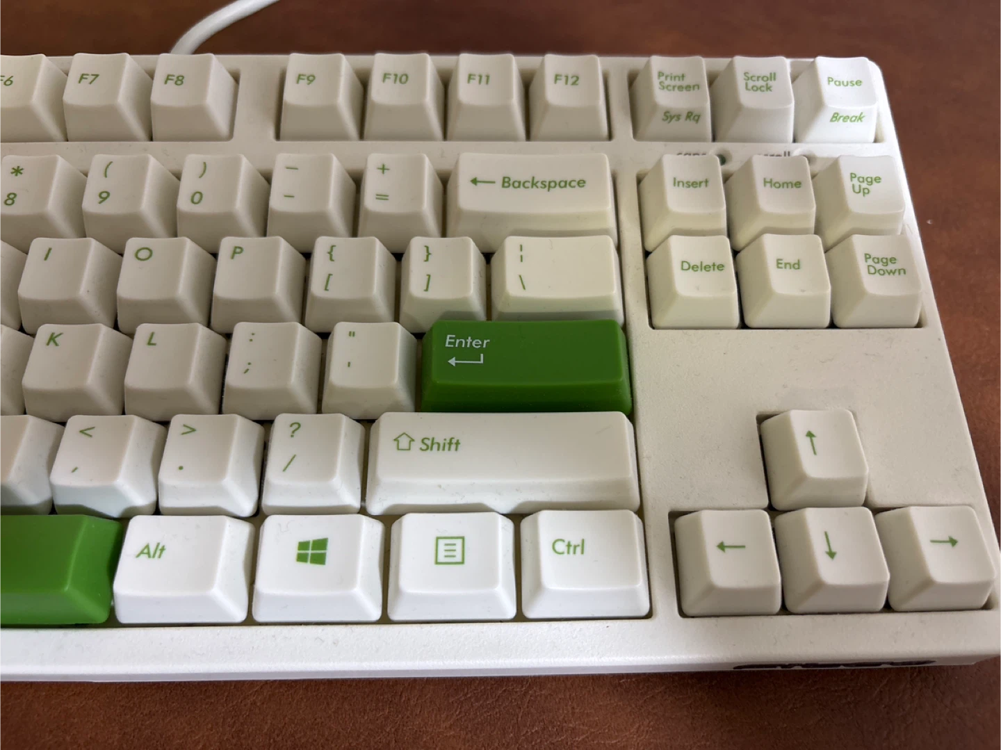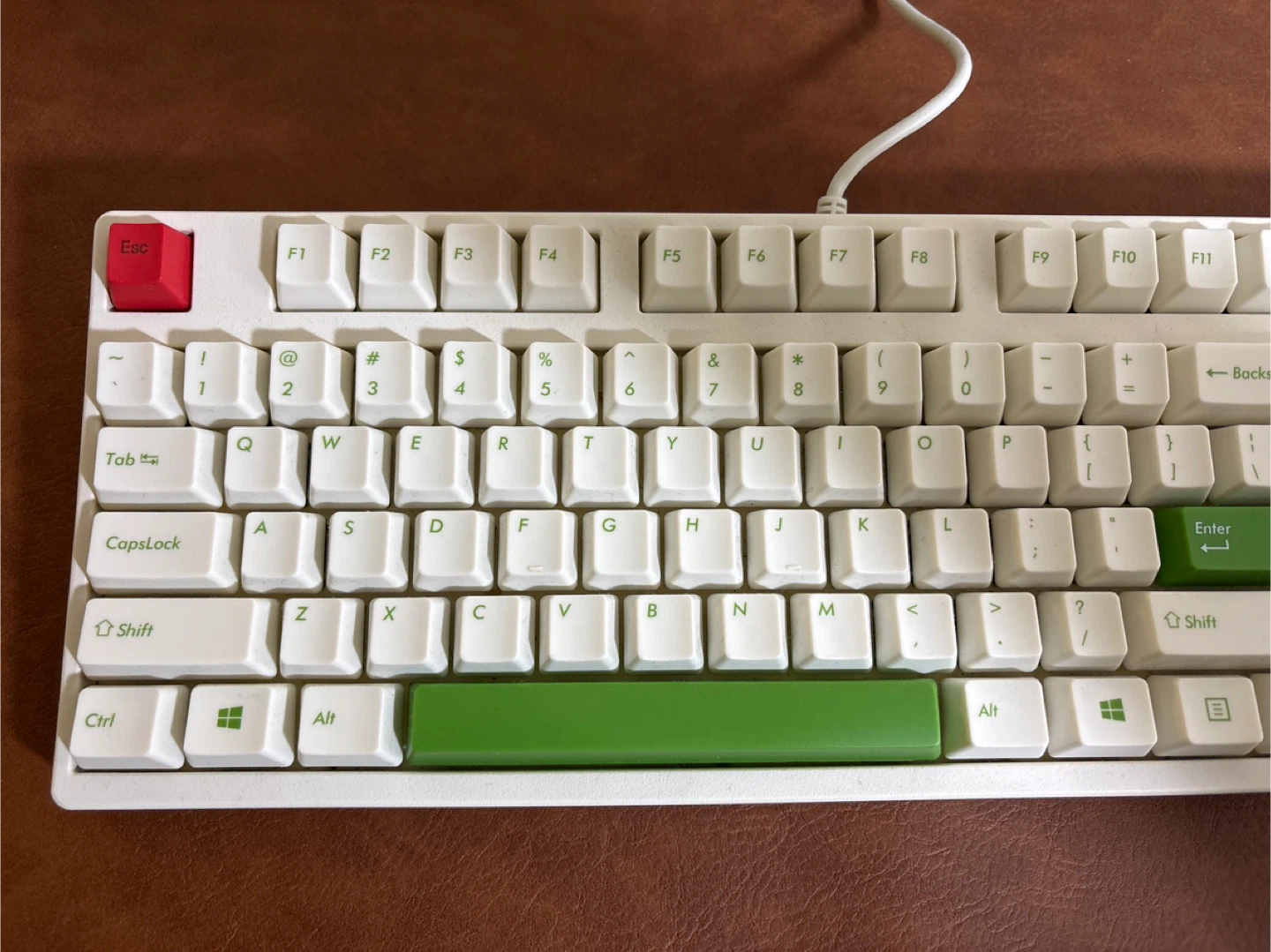 Selling a mechanical keyboard with white keycaps and green accents on the Enter, Alt, and Spacebar keys. It’s in great shape and ready for a new home! The keyboard has a classic layout and a wired connection.