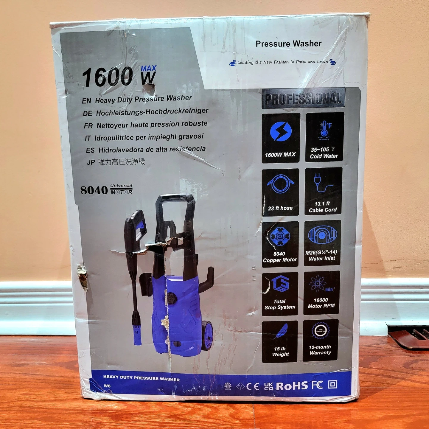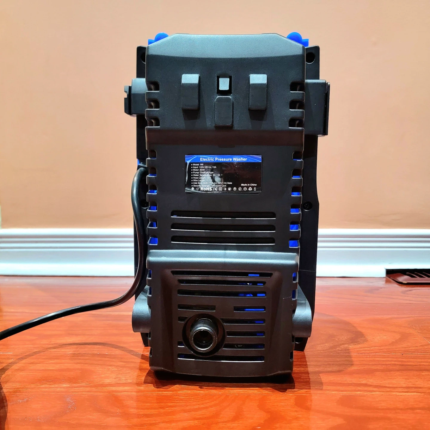 23ft hose, 2.6 Gallons Per Minute flow rate, can clean stains more efficiently, avoids the single laborious work mode of traditional tools, long distance cleaning, Great for cleaning: (concrete, pavements, driveways, patios, decks, walkways, cars, boats, homes, fences, furniture), All-in-one nozzle design switches spray angle from 0-120°, adjust pressure for different tasks, included external foam pot produces dense foam for foam cleaning, compact and portable, plug in and use it, high-pressure hose, two rollers, anti-tipping design, can also be used to draw water directly from a bucket, environmentally friendly, designed with TSS, the pump will automatically stop when the trigger is not activated, child safety lock, 120V, 13A, 60Hz, 8040 motor, 13.1 ft wire, water temperature from 35-120 F, three plunger pump, M26 17mm male inlet.
