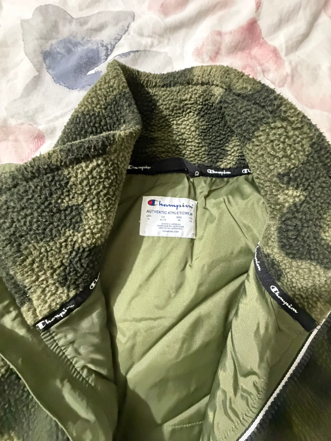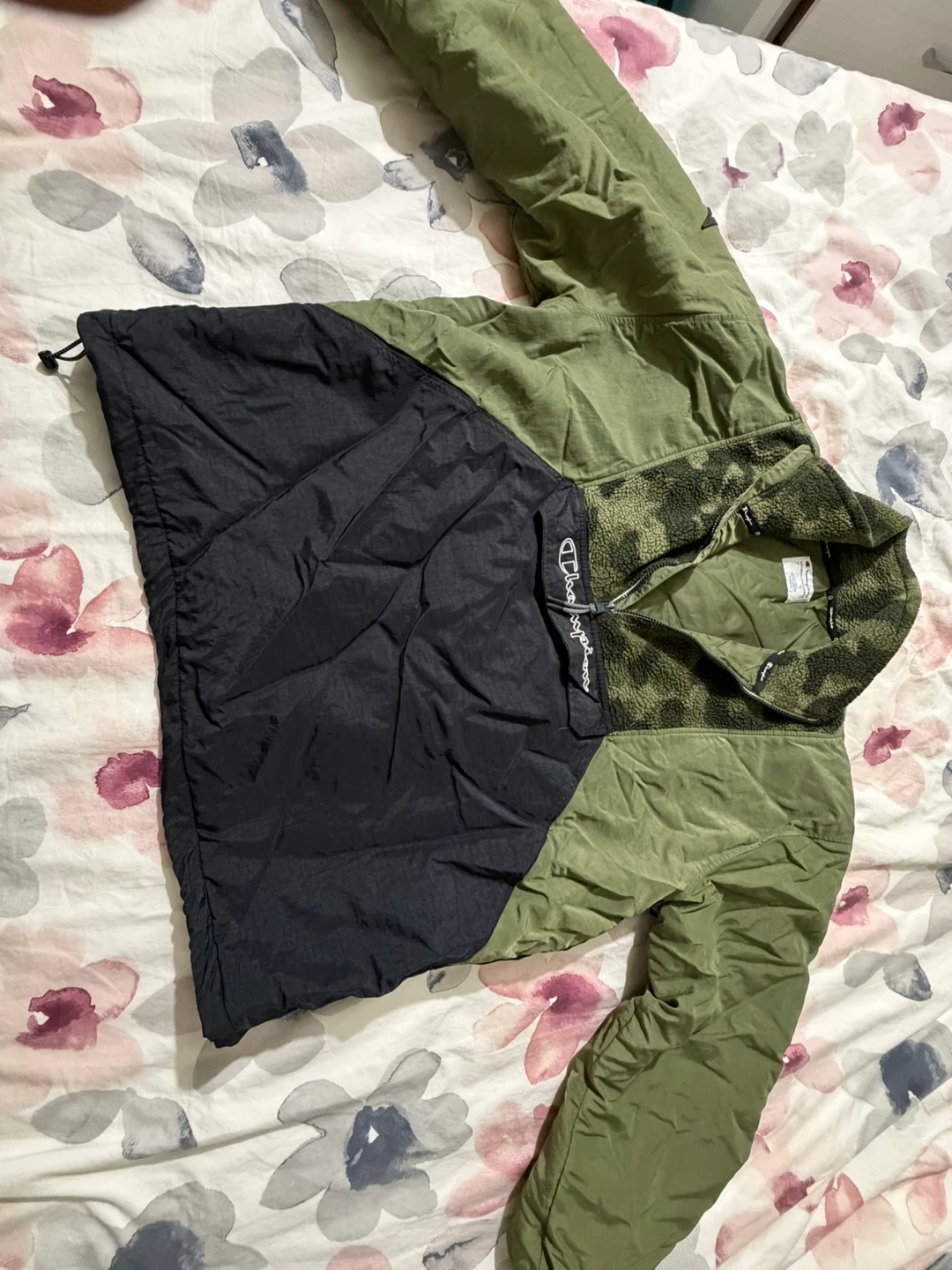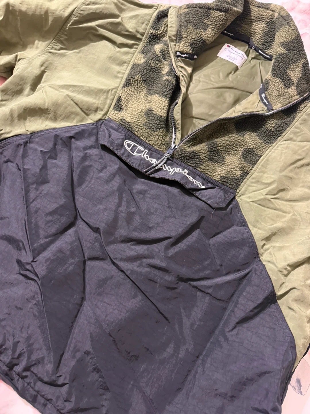 Selling a Champion pullover jacket in a combination of green and black. The jacket features a quarter-zip design and a cozy, patterned fleece collar. It's perfect for cooler weather!