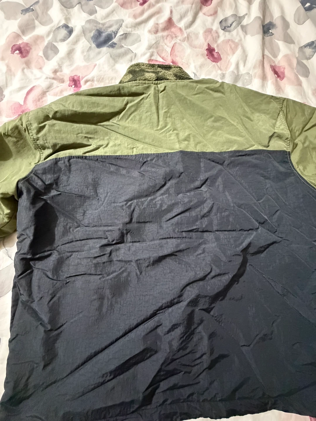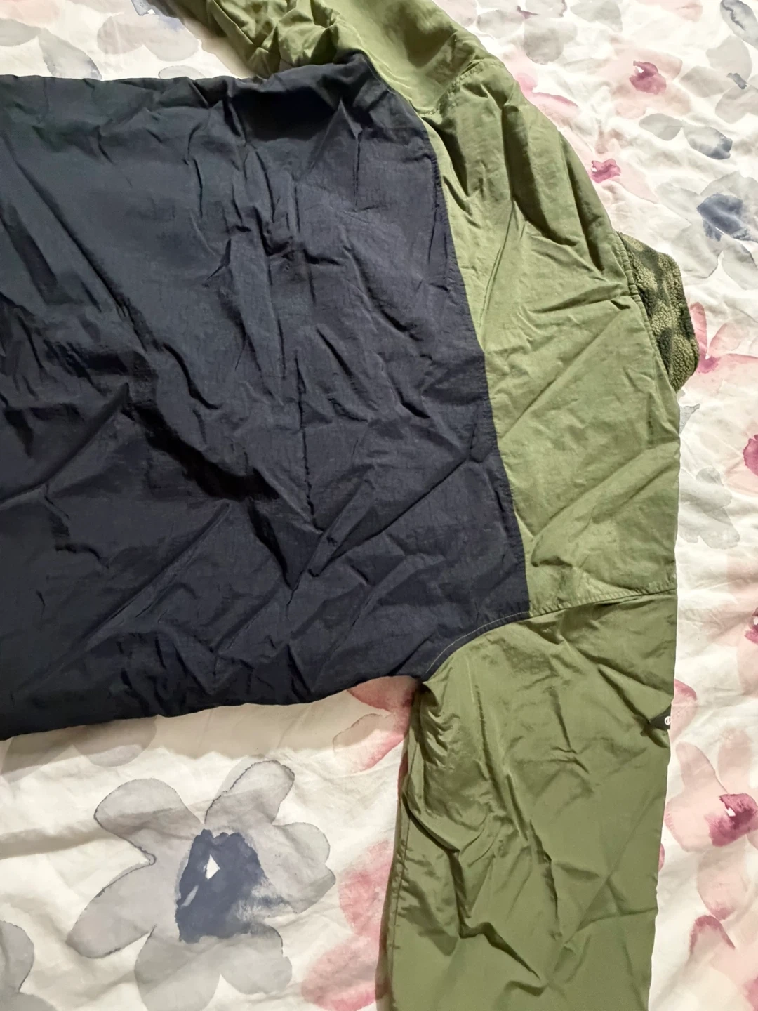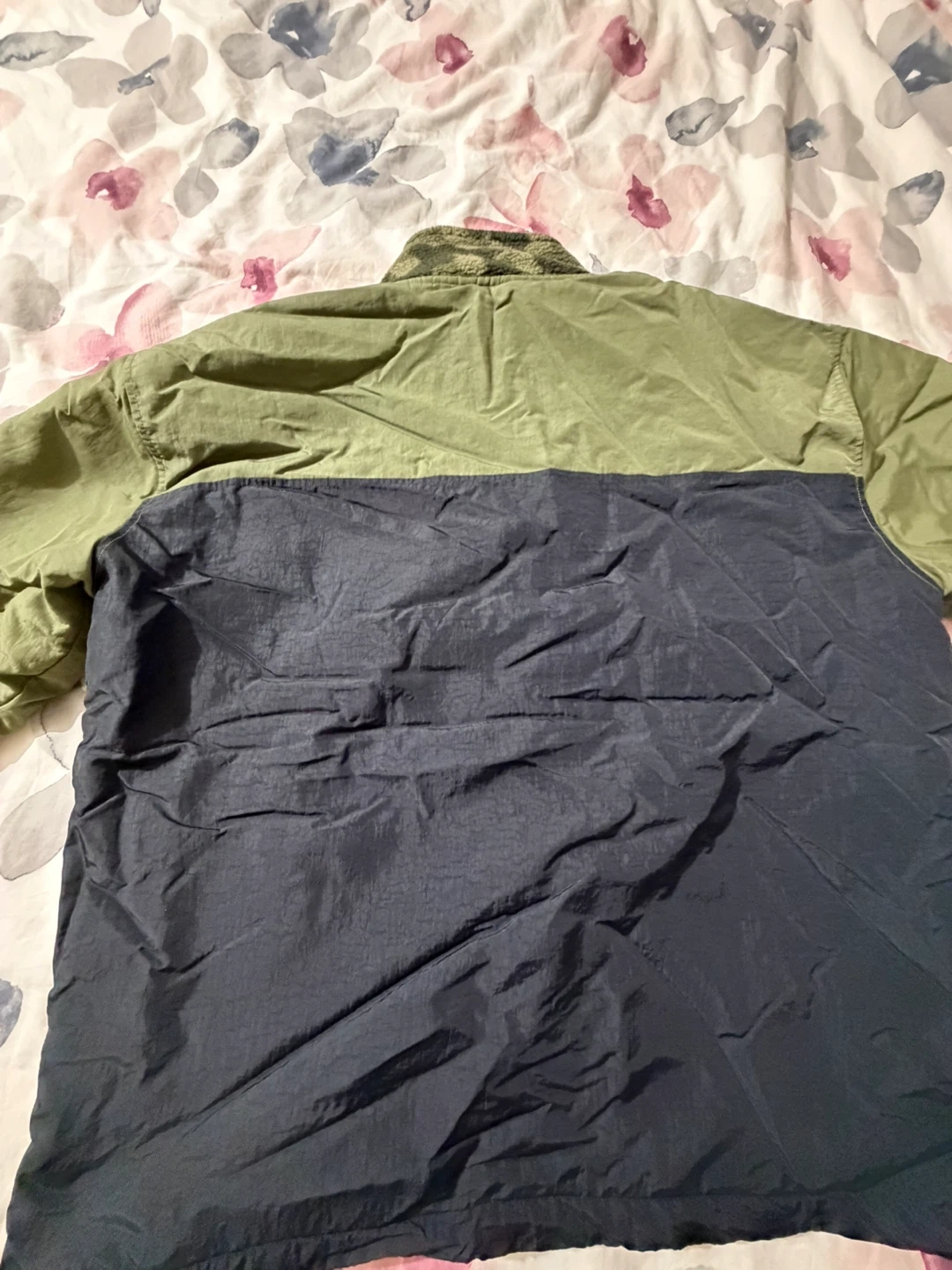 Selling a Champion pullover jacket in a combination of green and black. The jacket features a quarter-zip design and a cozy, patterned fleece collar. It's perfect for cooler weather!