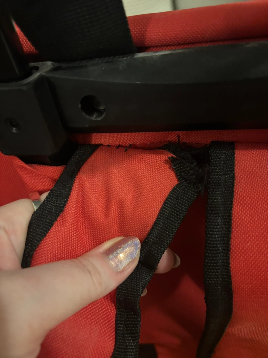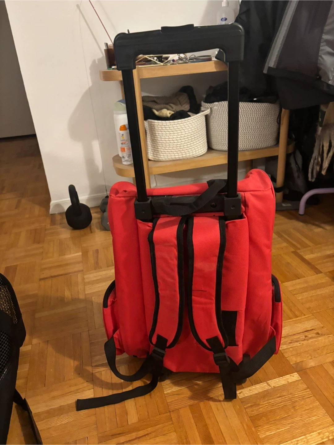 Selling a red pet carrier backpack with wheels! The carrier has a handle for easy rolling (like a suitcase) and backpack straps for carrying. There is some minor tearing on the straps, pictured in the last photo, so it could use some repair. Can still be worn with one strap or used perfectly fine as a rolling carrier!