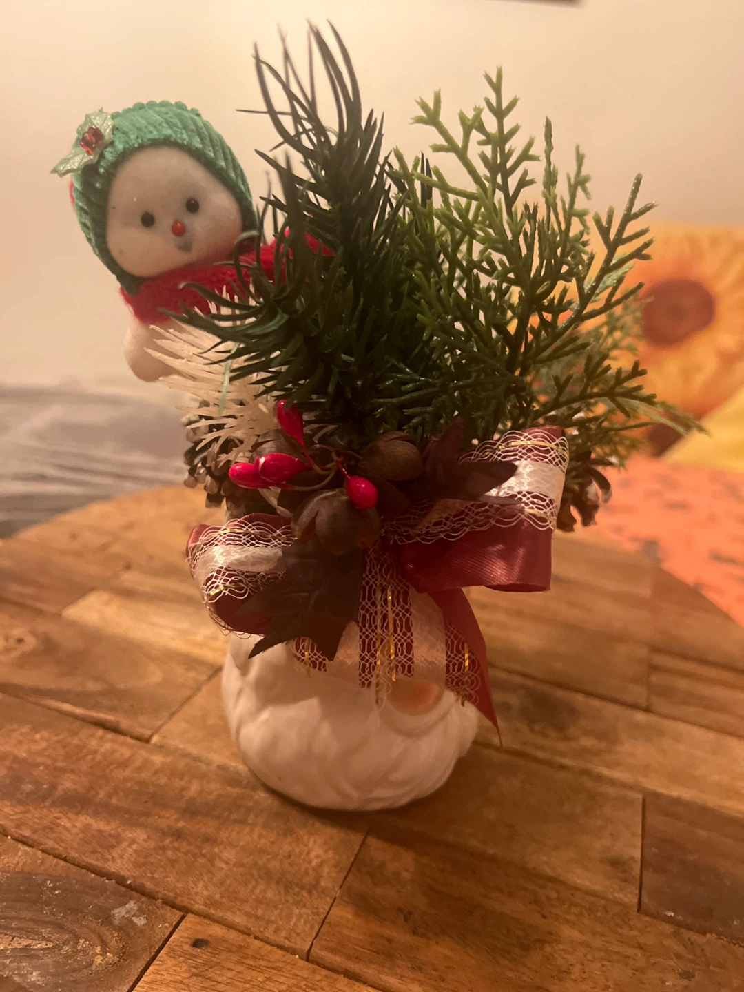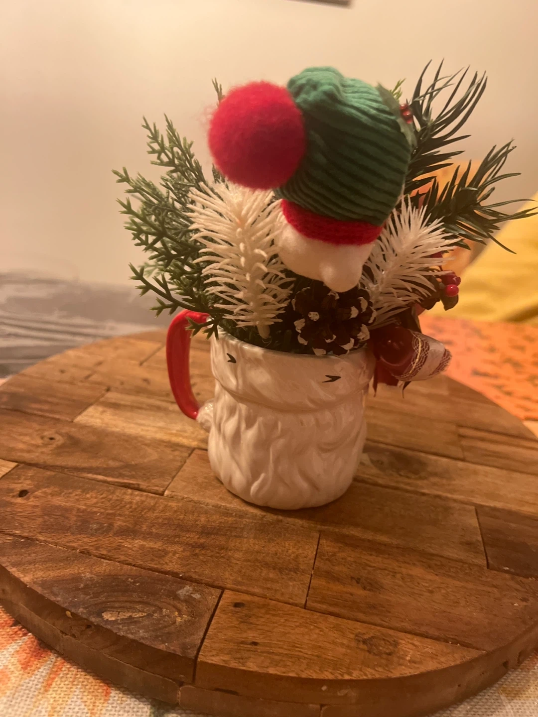 Festive Santa mug with a charming floral arrangement! Perfect for adding a touch of holiday cheer to your home decor. It features a cute Santa face mug filled with faux greenery, pinecones, and a decorative bow. A lovely addition to your Christmas decorations