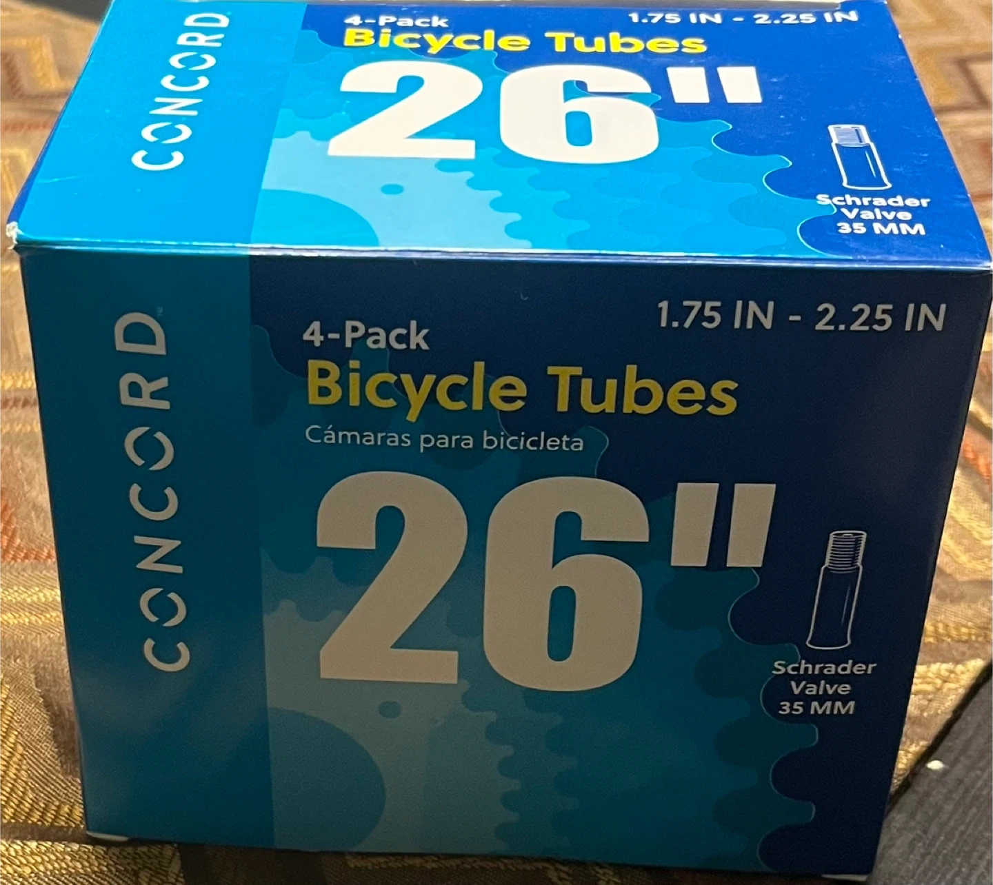 10 for 1 or 30 for all 4. Selling a brand new, 4-pack of Concord 26" bicycle tubes! These tubes are designed for tires ranging from 1.75 inches to 2.25 inches. Each tube has a Schrader valve (35mm). Perfect for keeping as spares or replacing worn-out tubes on your bike!