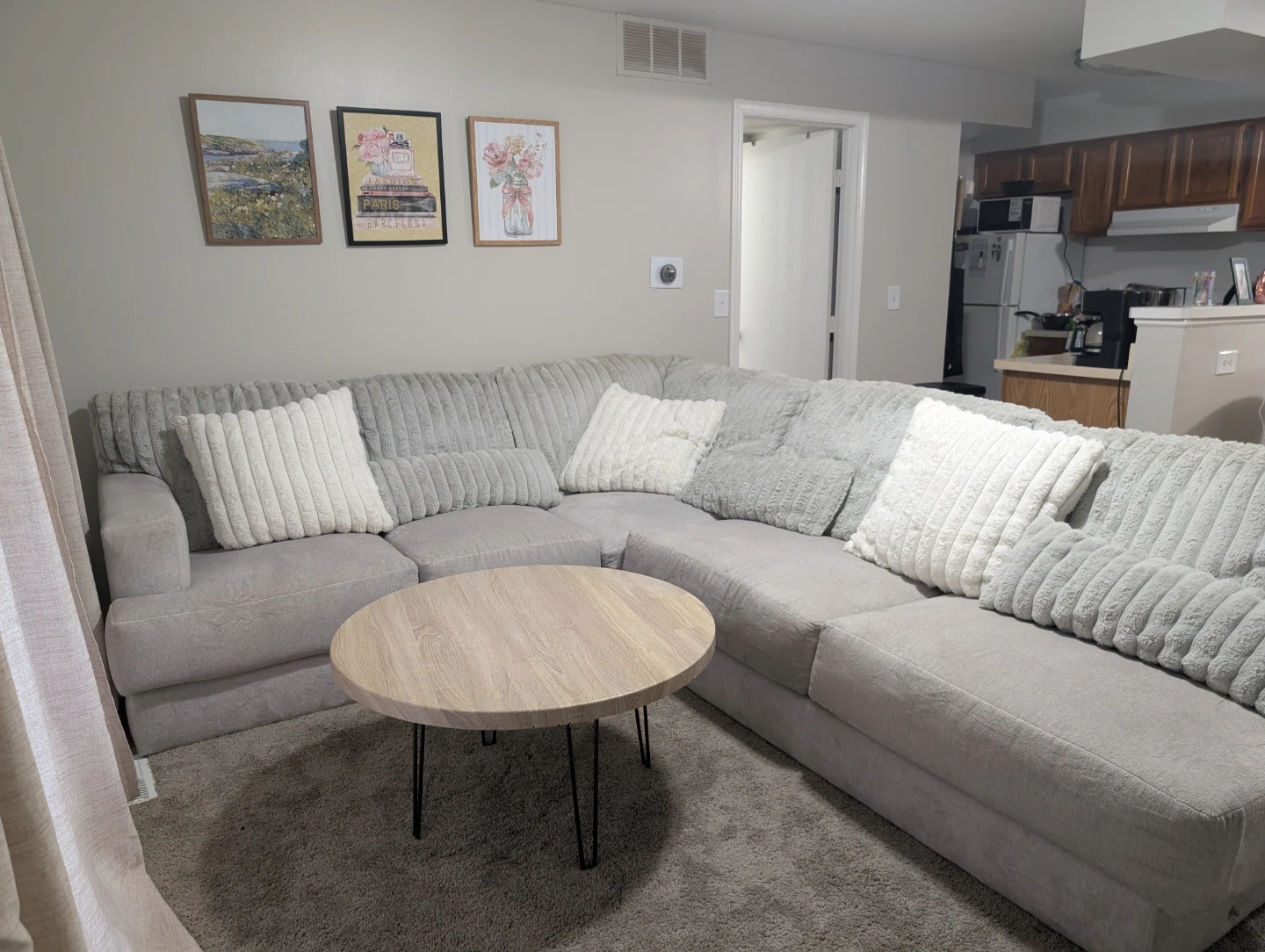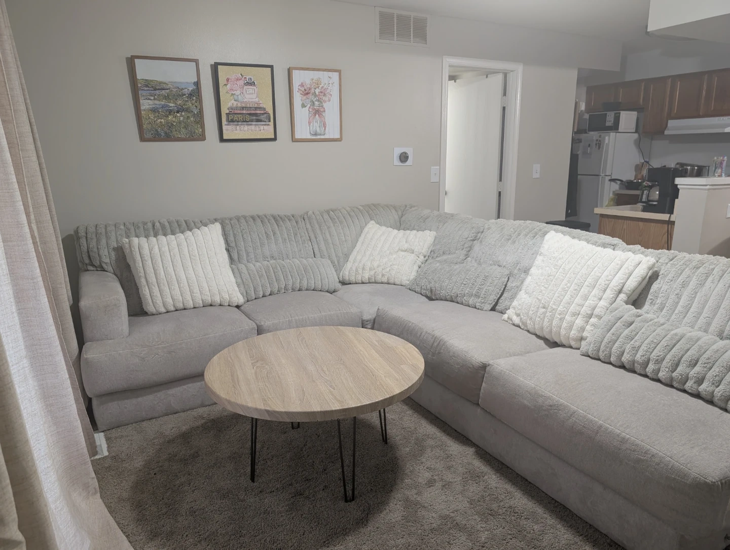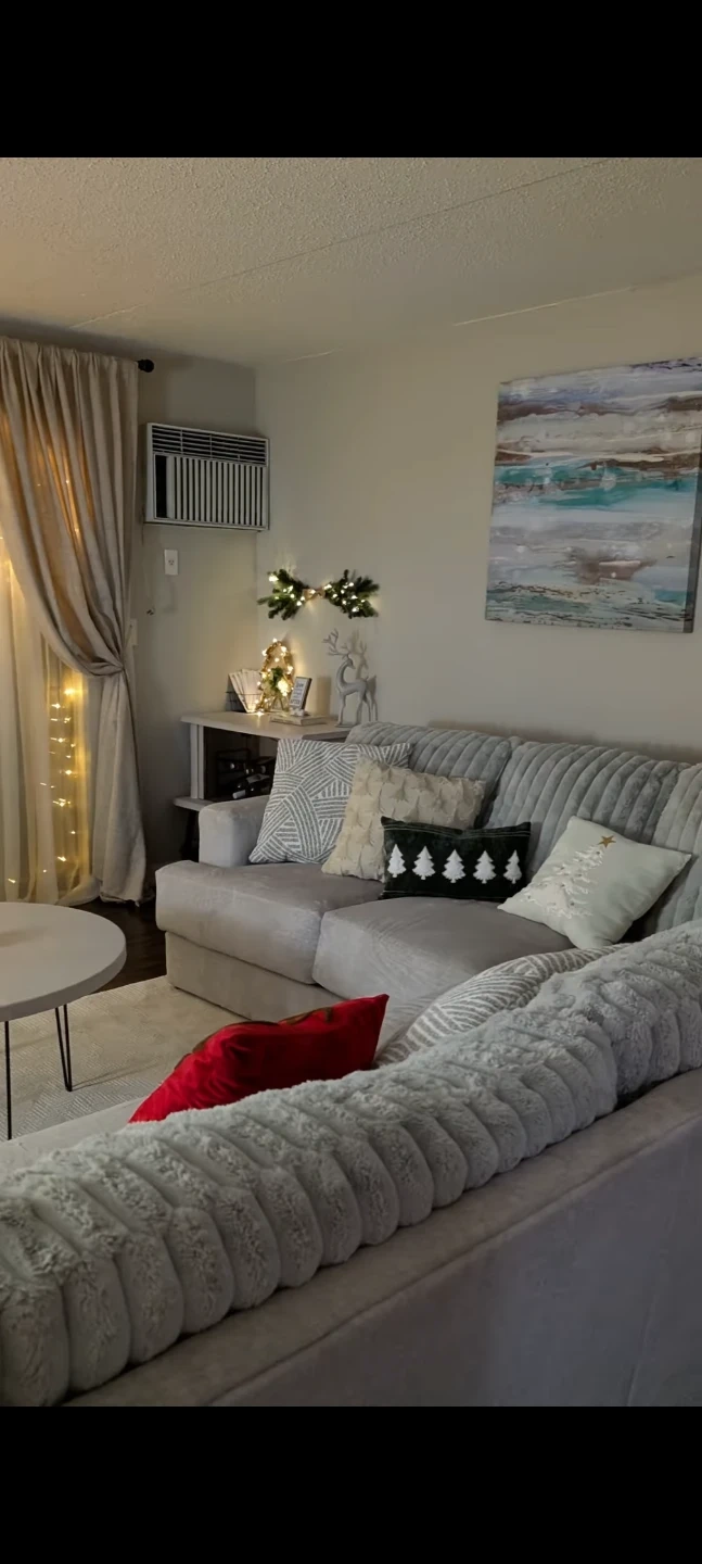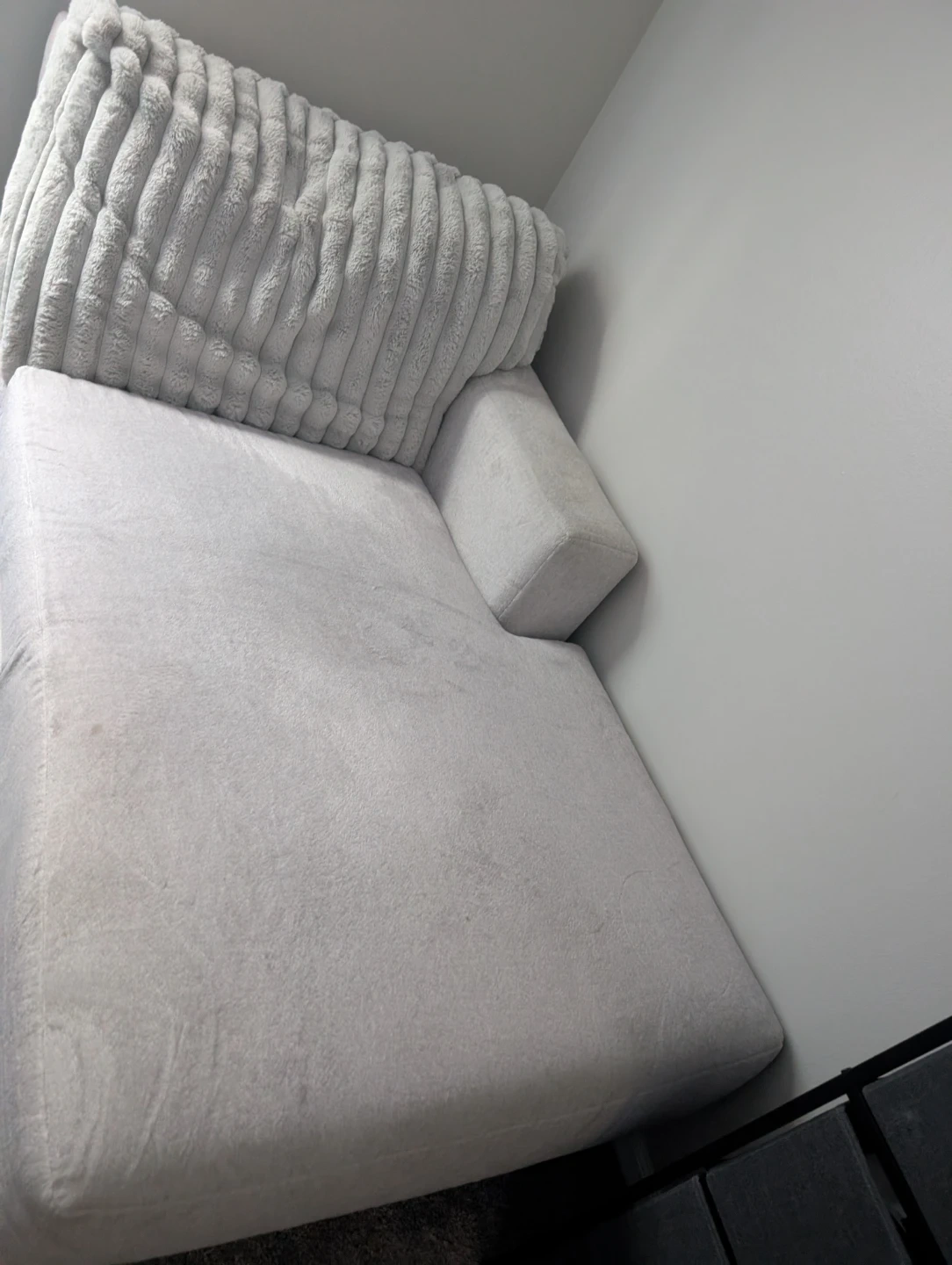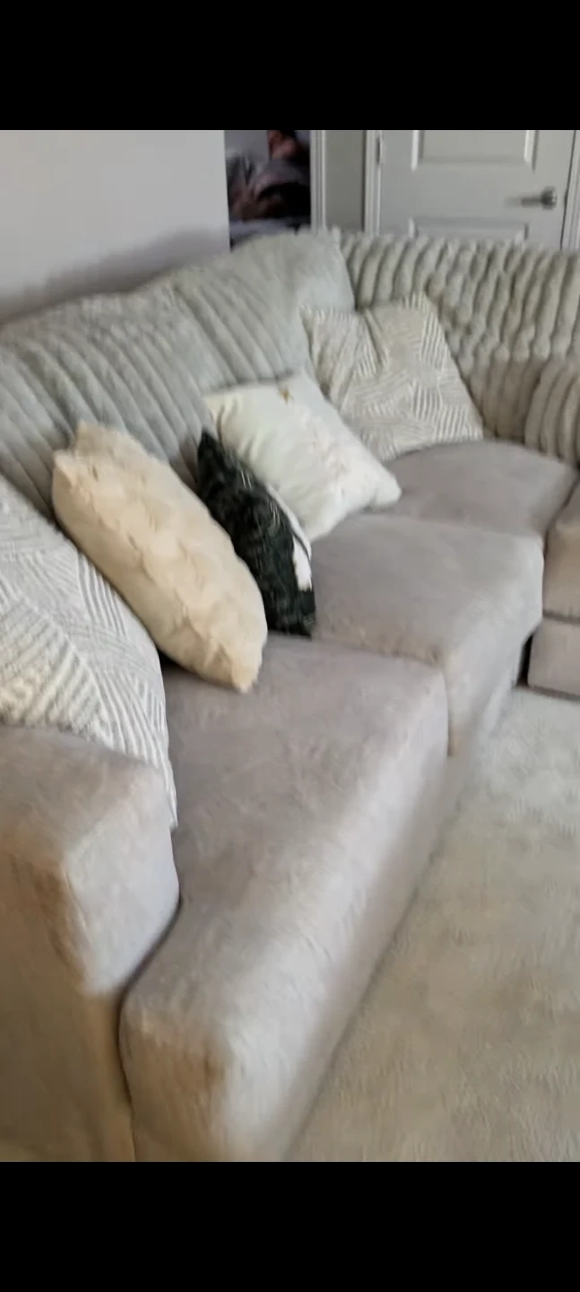 Selling a sectional couch in light gray. It's in great condition and would be a addition to any living room. The couch has a soft, comfortable texture and a modern look that blends well with various decor styles. Perfect for lounging and relaxing!