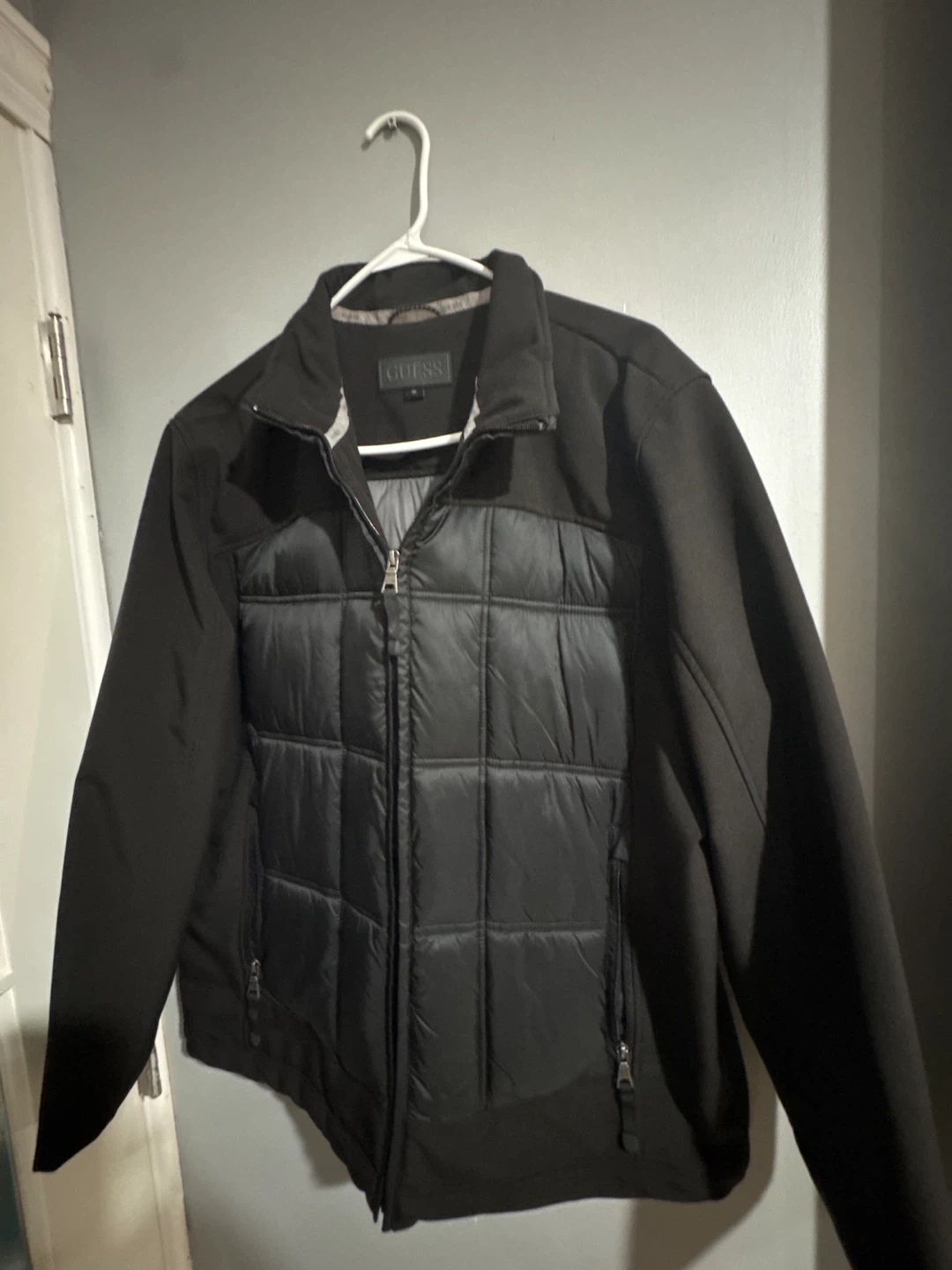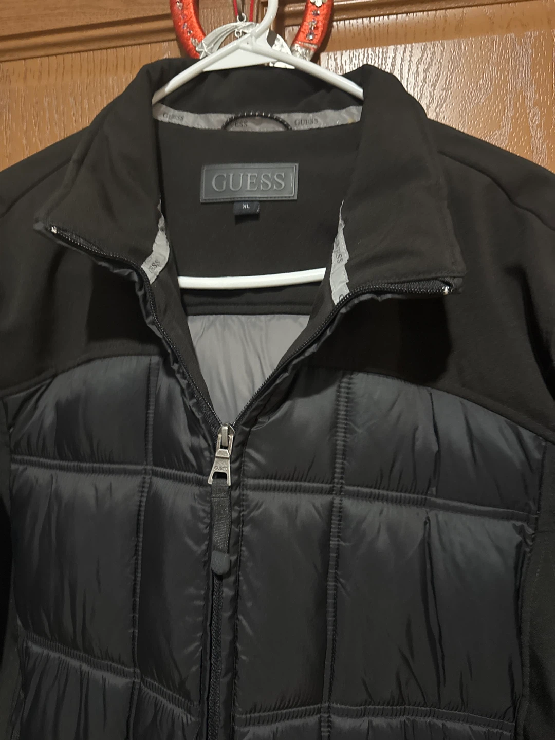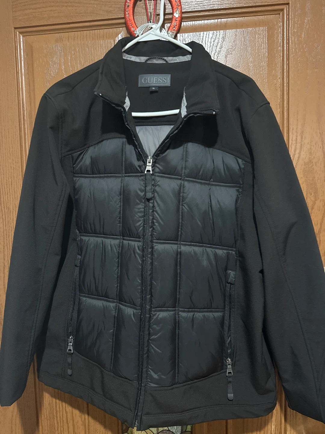 Selling a Guess black puffer jacket in men's size XL. It's in great condition and ready for a new owner! Perfect for staying warm and stylish