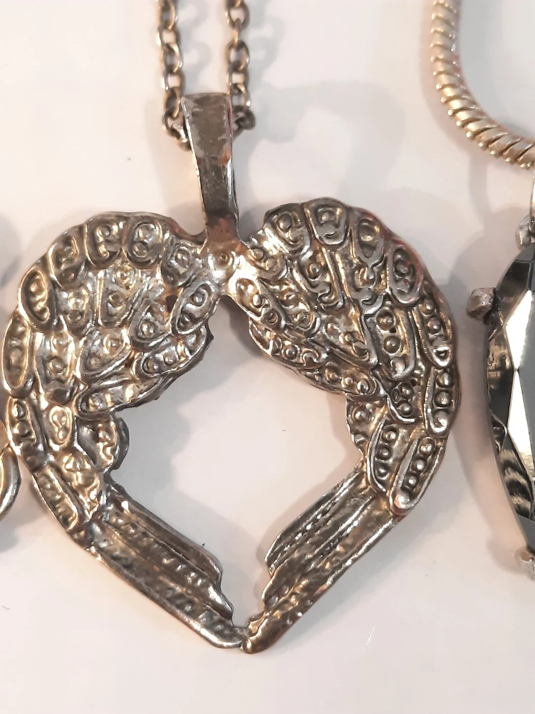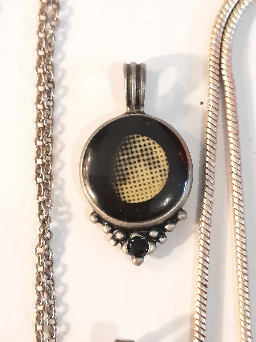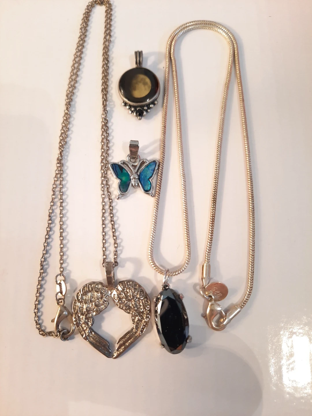 A collection of assorted pendants and chains.the 2 chains are stamped 925. There is a butterfly pendant, a heart pendant, a black stone pendant, and a moon pendant. All are in good condition.