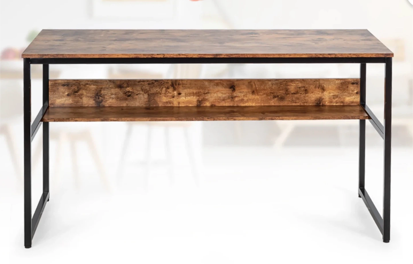 Looking to sell this stylish desk! It features a rustic brown tabletop and a black metal frame, giving it a modern industrial look. It also comes with a convenient shelf for extra storage or displaying books and decor. Perfect for a home office or study space!