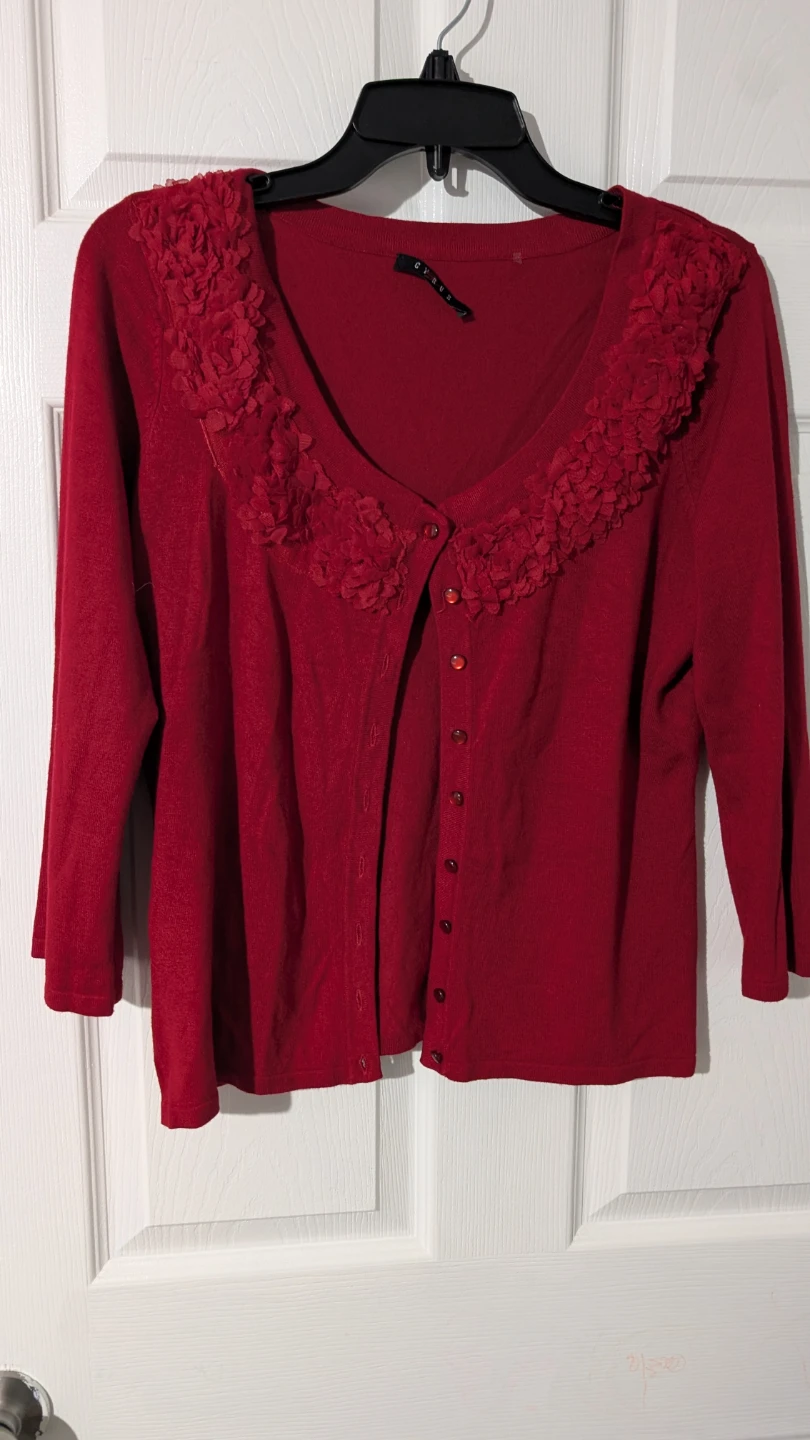 Here's a lovely red cardigan from Cyrus! It features a unique floral design around the collar and a button-down front. Perfect for adding a pop of colour to your wardrobe