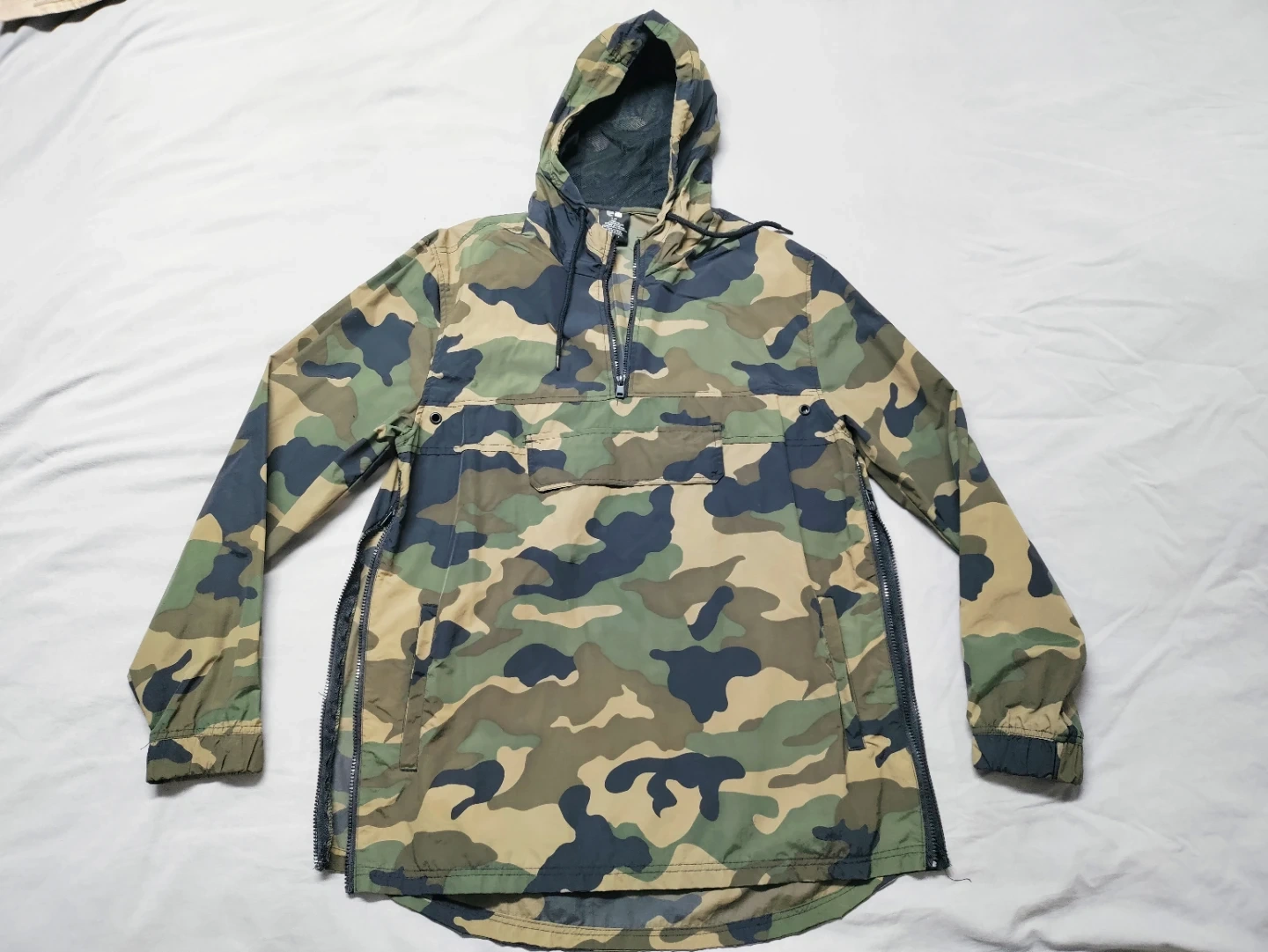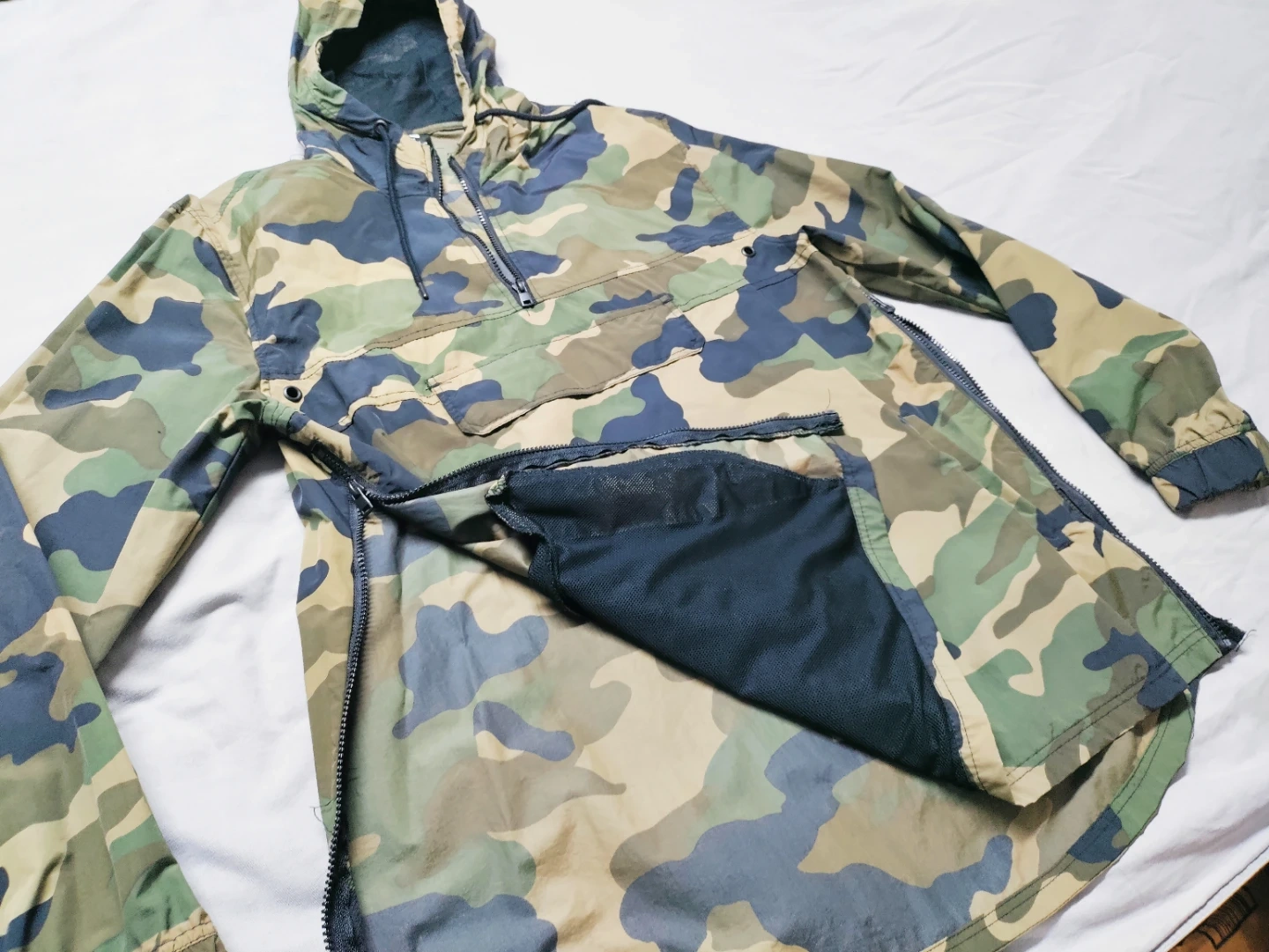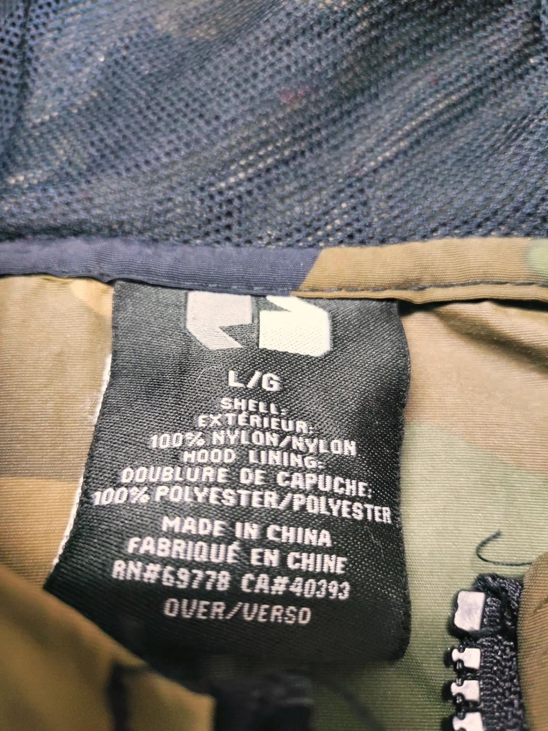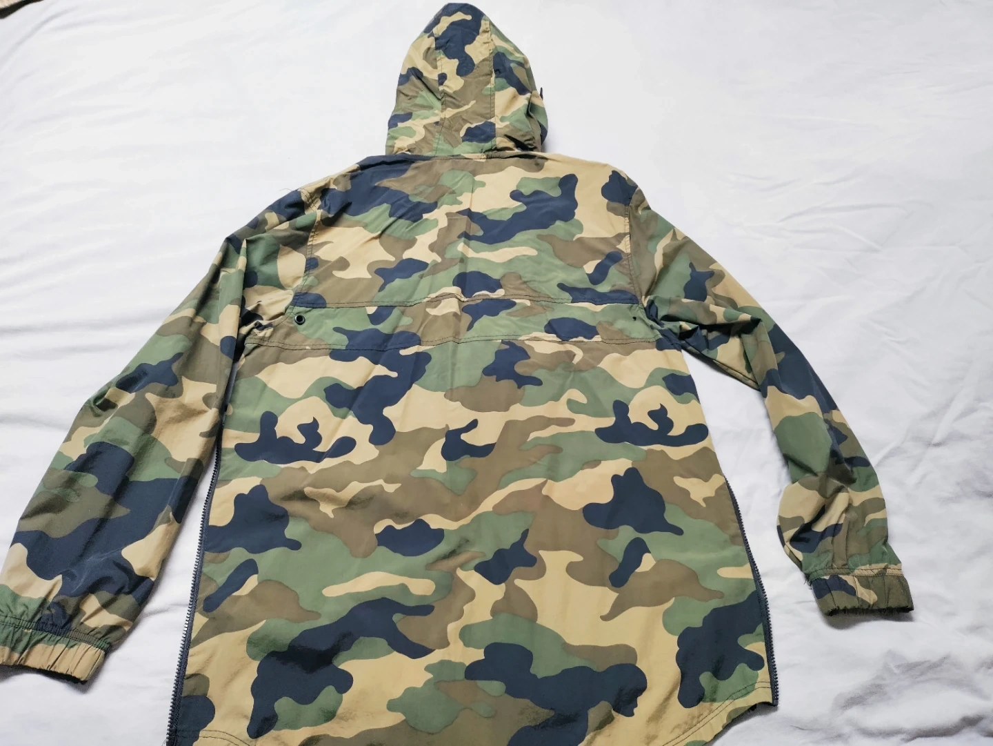 Selling a camouflage anorak jacket in size large. The shell is made of 100% nylon