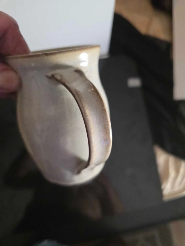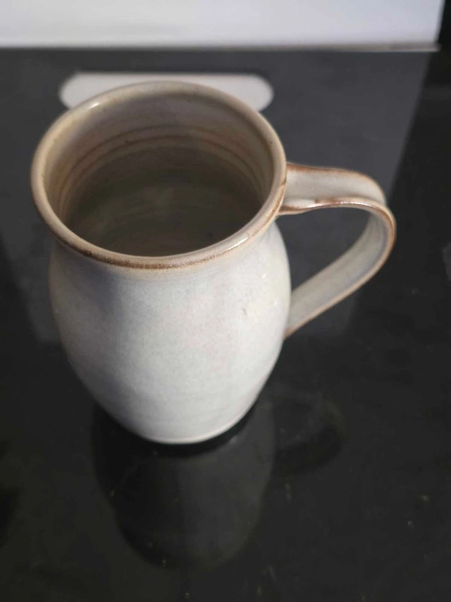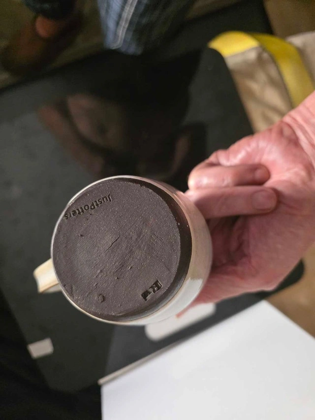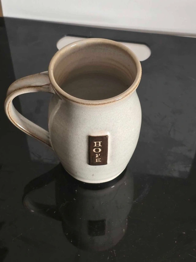 This is a ceramic mug, inspirational in nature and handmade with care. It is in great condition and ready to bring a bit of hope to your morning coffee or tea. It says HOPE on the side. It is branded as JustPotters on the bottom. A little inspiration to start your day, what could be better? If the ad is up, it's still available!