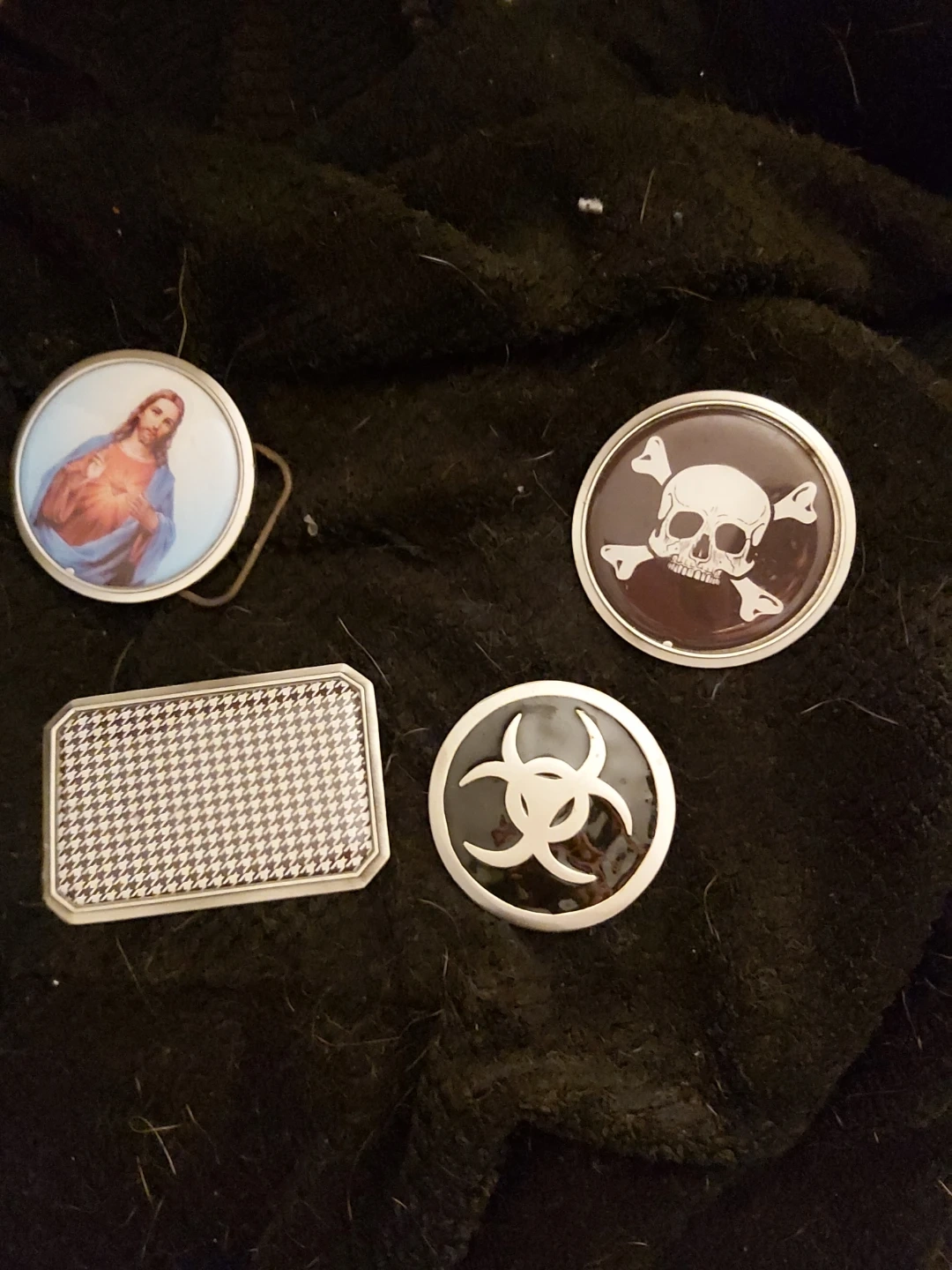 Selling a collection of vintage belt buckles! There's one with a picture of Jesus, one with a skull and crossbones, one with a biohazard symbol, and a rectangular one with a houndstooth pattern. They're all in good condition and ready to add some flair to your outfit