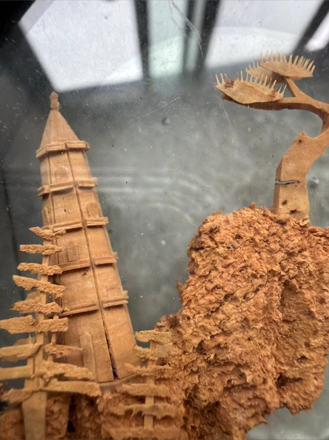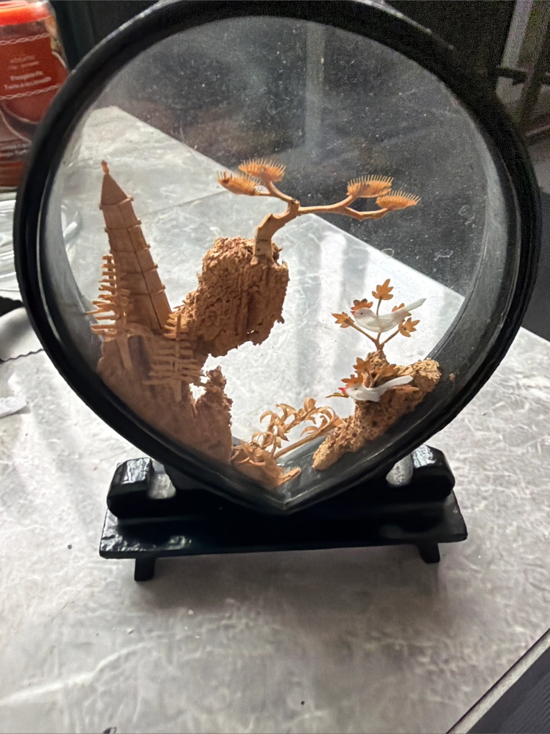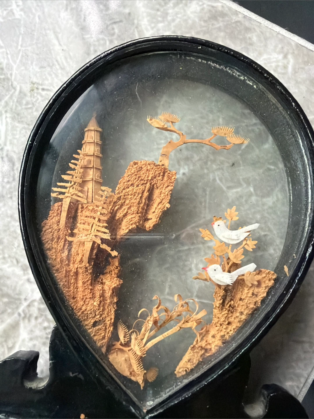 This is a decorative display dome featuring a miniature landscape with a pagoda, trees, and birds inside a glass dome on a black stand. It's a unique piece to add to your home decor collection!