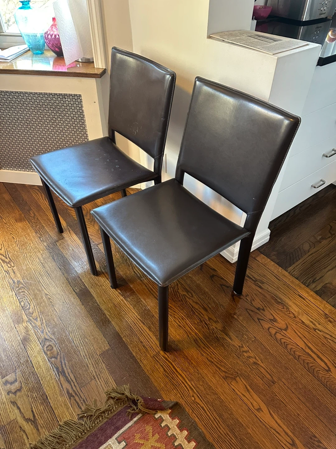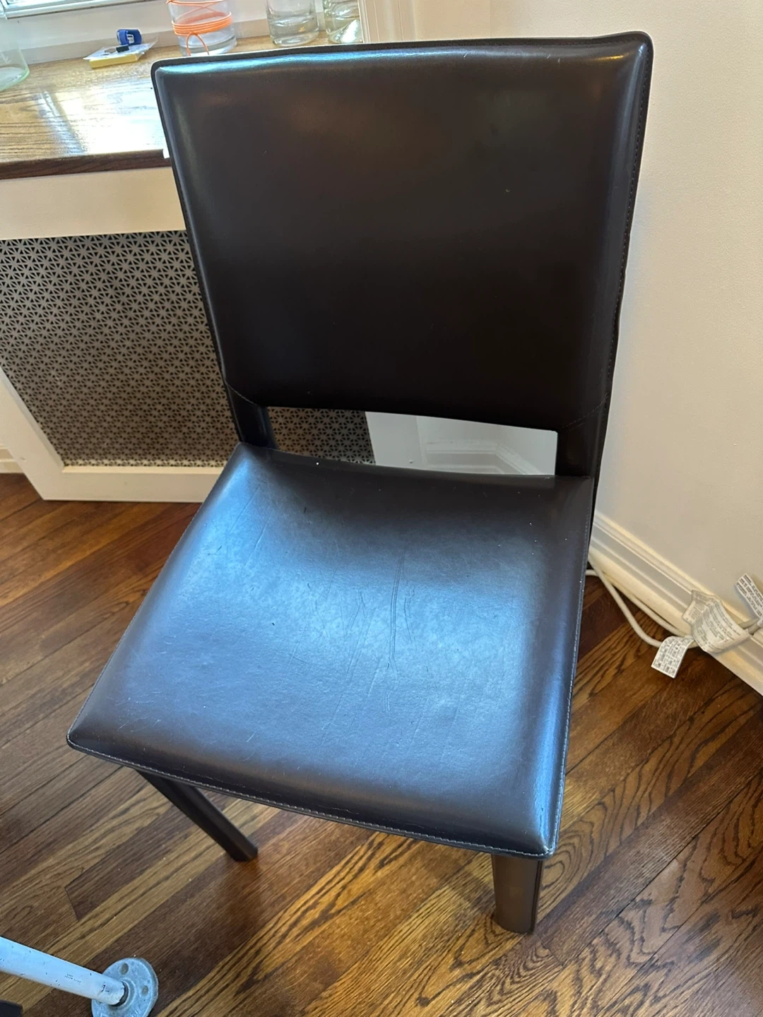 Selling a set of six brown R&B leather dining chairs. They have a sleek, modern design and are perfect for any dining space. The chairs are in good condition and ready for a new home!