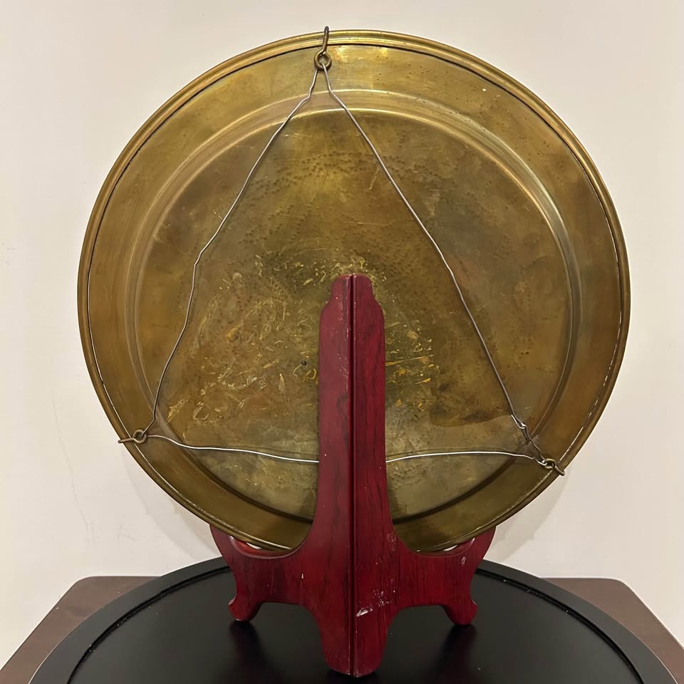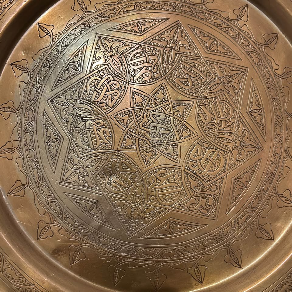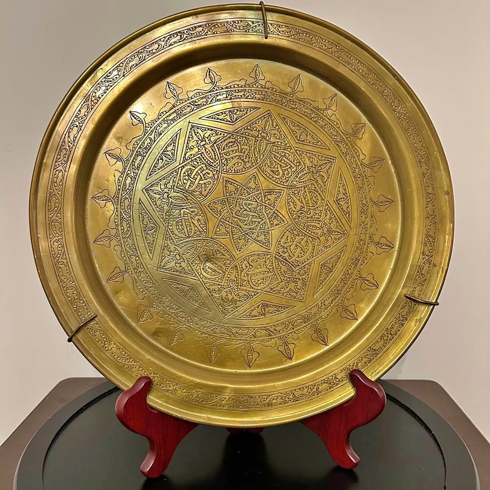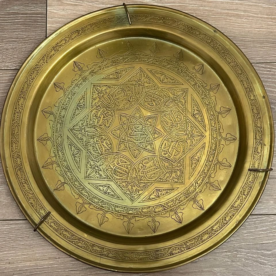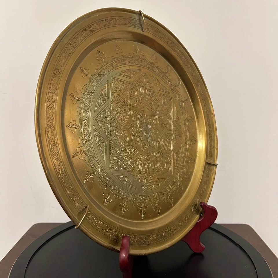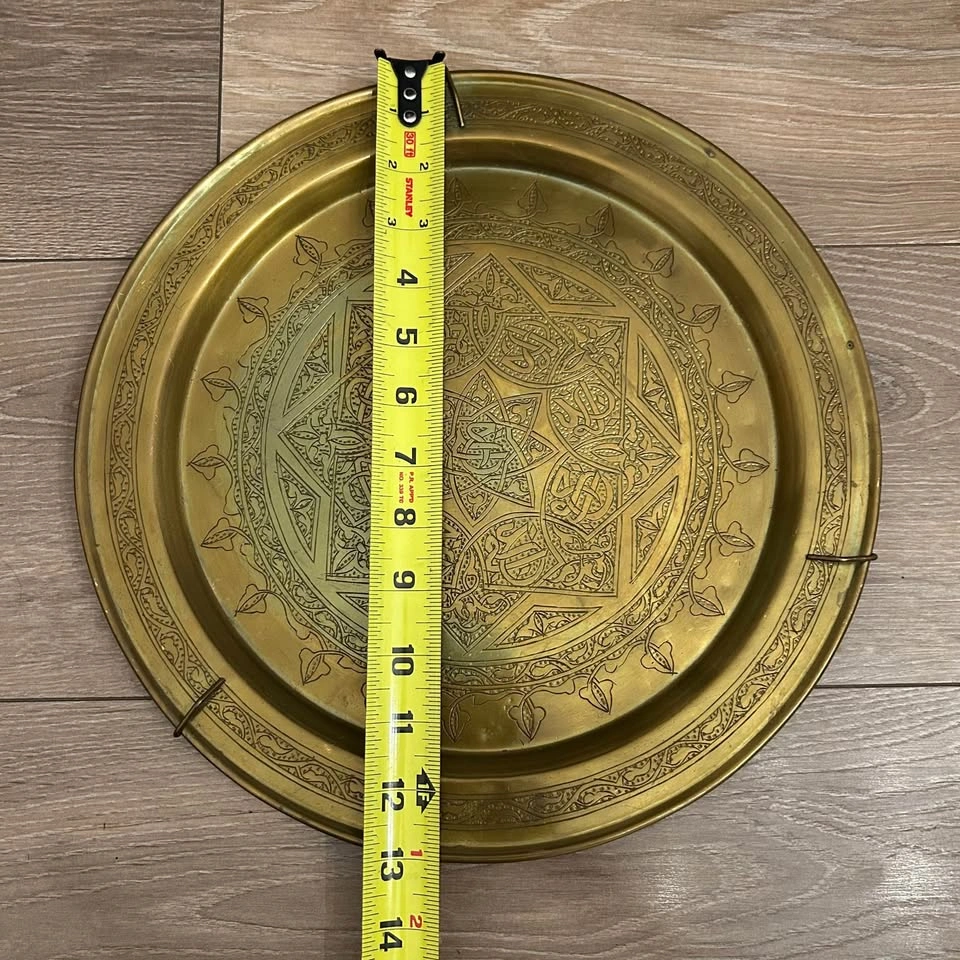 Vintage brass Middle Eastern decorative tray with beautiful hand-engraved geometric and floral patterns. Classic Mamluk-style design, great for wall décor, display, or as an accent piece. Solid brass with detailed traditional workmanship.