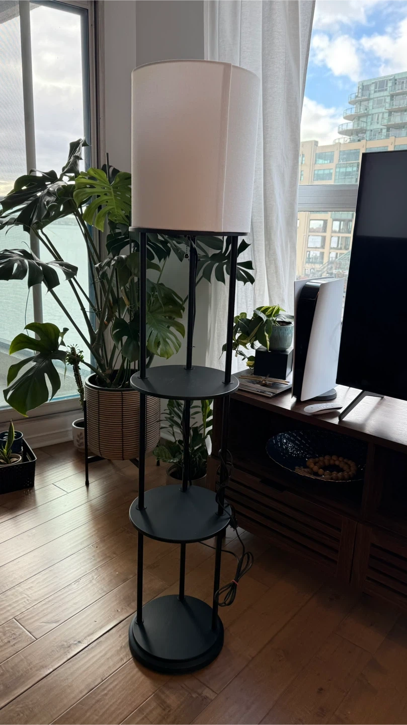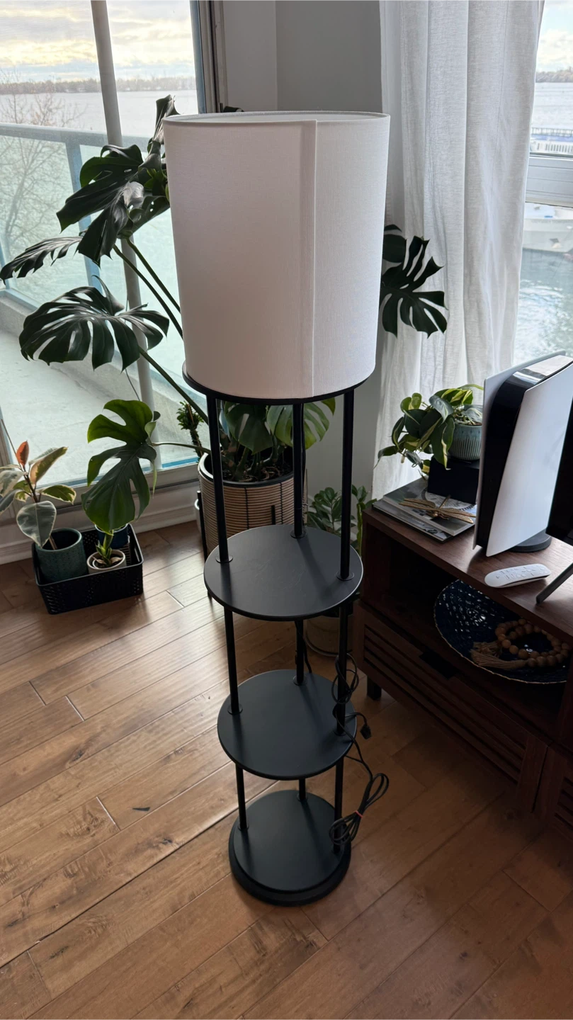 Selling a 5-foot floor lamp with 3 built-in shelves and a 10-inch diameter. Used minimally to hold décor, so it’s in excellent condition. The metal frame is sturdy and well-balanced, the lampshade is clean and looks new, and the light is bright.