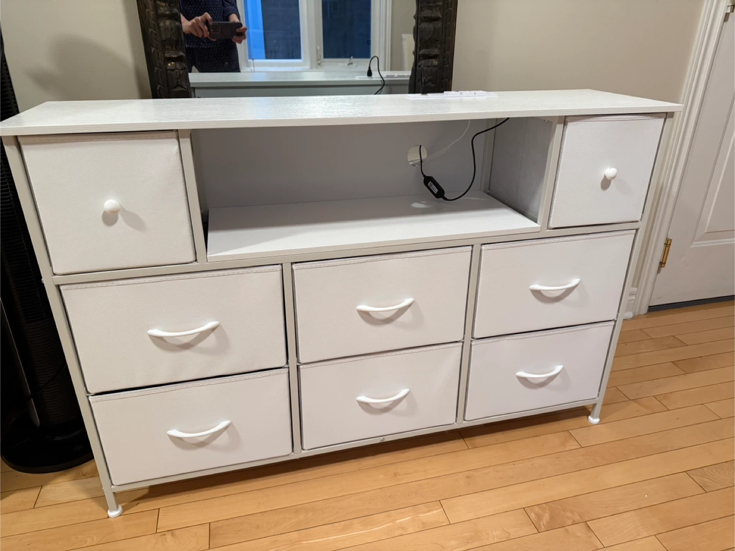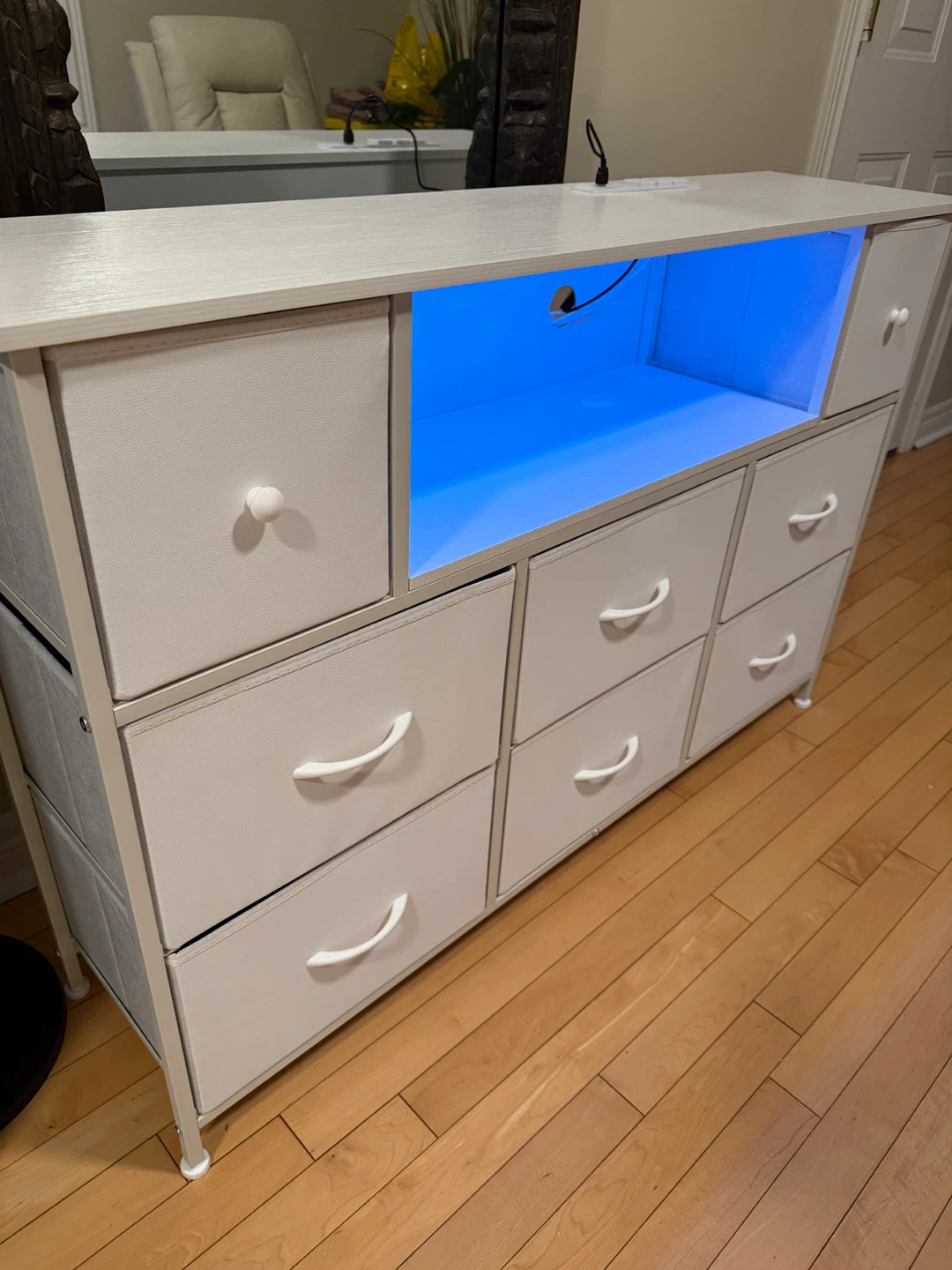 Here's a lovely white dresser that's in great shape! It features several drawers for ample storage and a cool LED light in the open compartment. Perfect for adding a bit of style and functionality to any room!