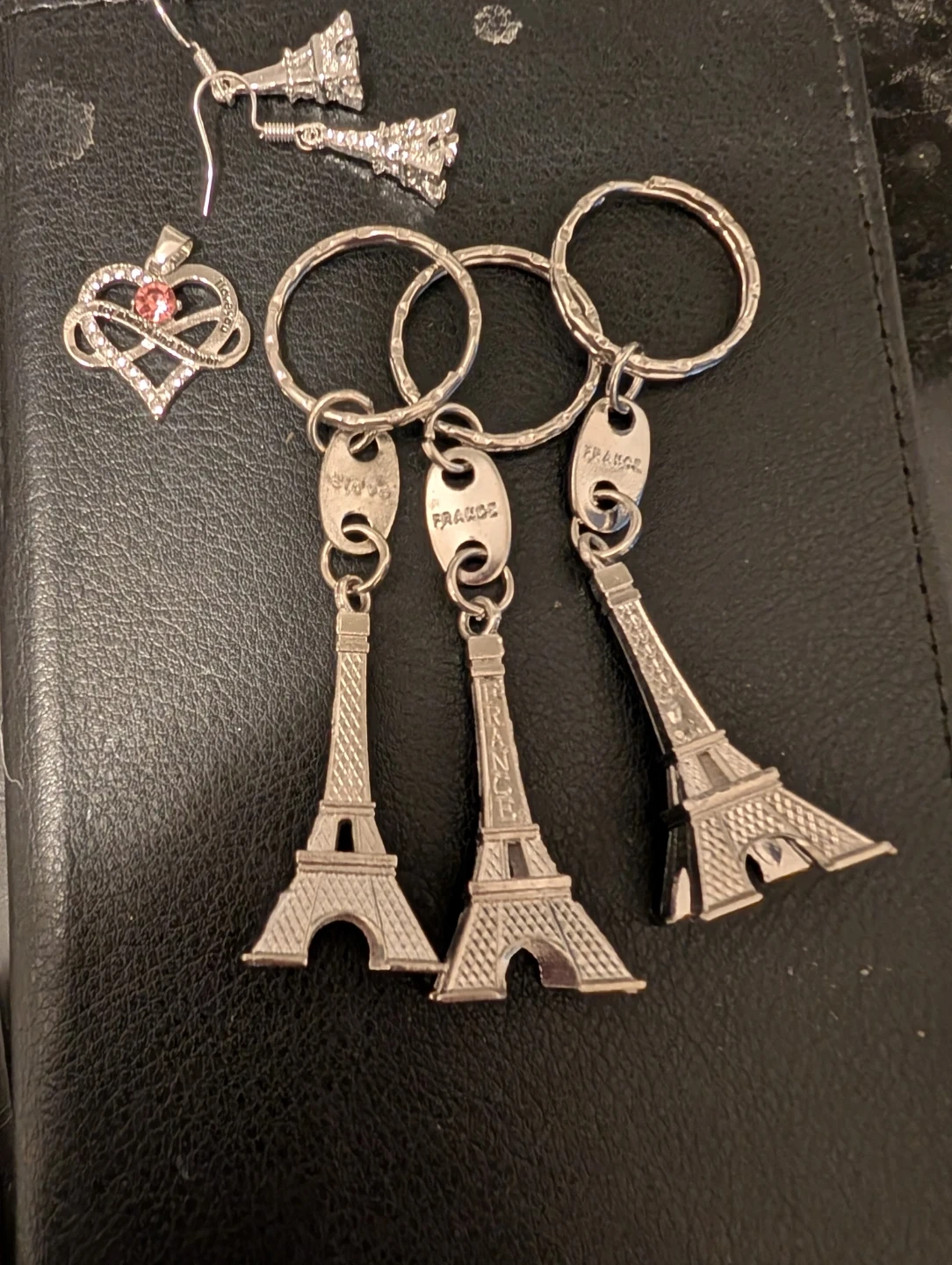 Giving away a set of Eiffel Tower themed keychains and earrings! The keychains feature a miniature Eiffel Tower design with 'FRANCE' engraved. Also included is a pair of matching Eiffel Tower earrings and a heart-shaped pendant. Perfect for anyone who loves Paris!
