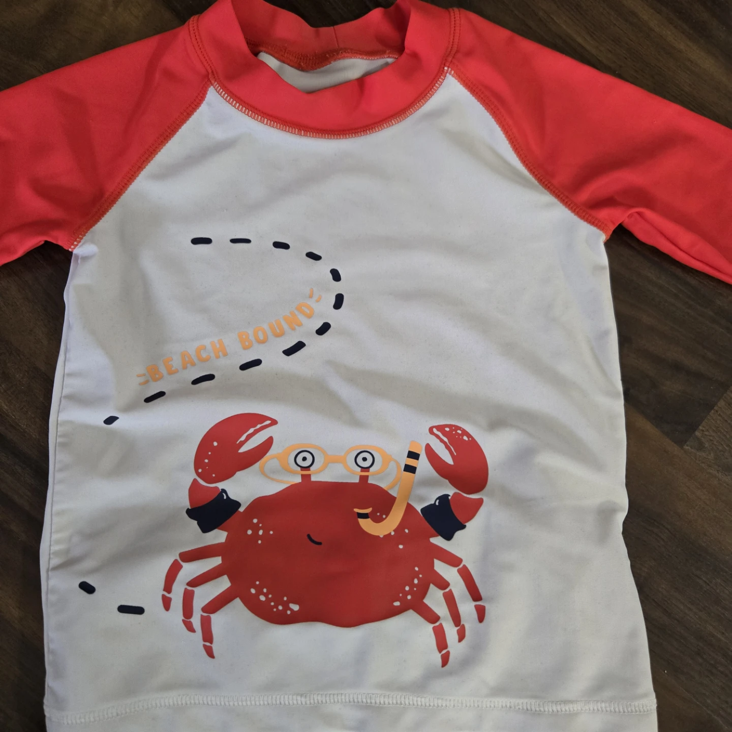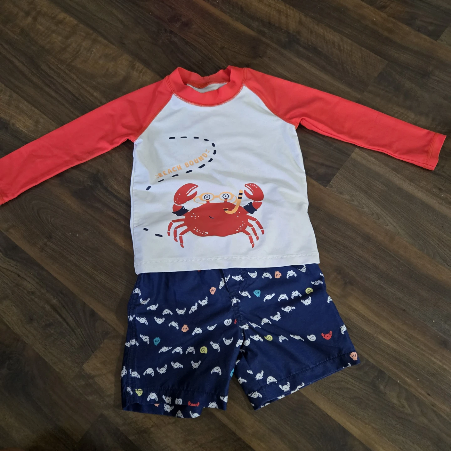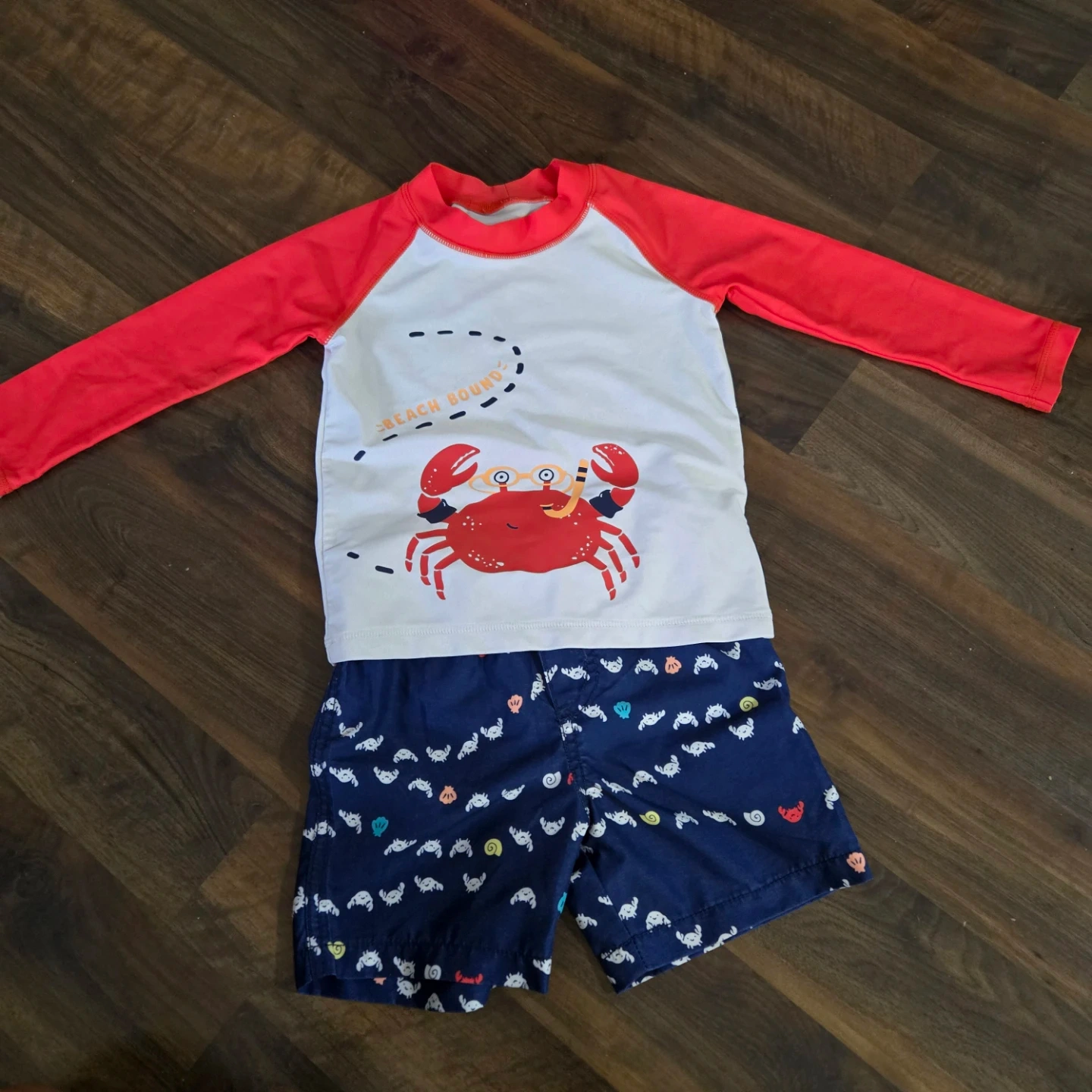 Cute Carter's rash guard and shorts set, size 24 months! The rash guard is white with red sleeves and a fun crab design. The shorts are navy blue with a crab pattern. Perfect for your little one's beach adventures!