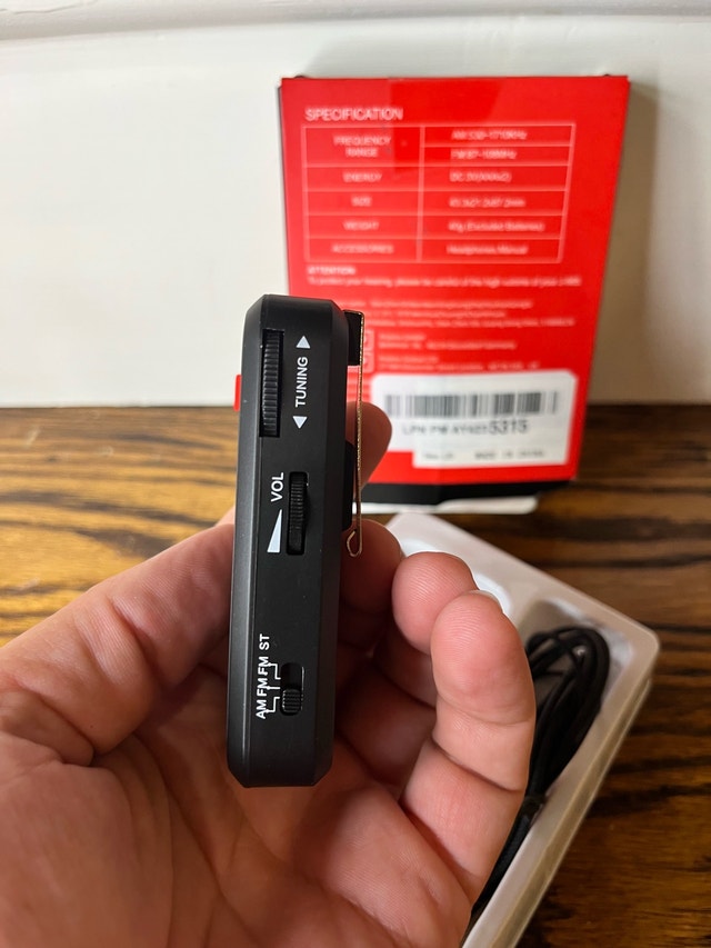 This thing is awesome. Needs headphones, no built in speaker. But it’s so compact and easy to use. So great Listen to your favourite AM/FM radio stations on the go with this new PRUNUS J-985 pocket radio, complete with included headphones and original box. The radio supports both AM (530-1710KHz) and FM (87-108MHz) frequencies, and operates on DC-3V (AAAx2) power. The compact size of 43.3x21.2x87.2mm and light weight of 40g (excluding batteries) make it perfect for travel, workouts, or just relaxing at home.