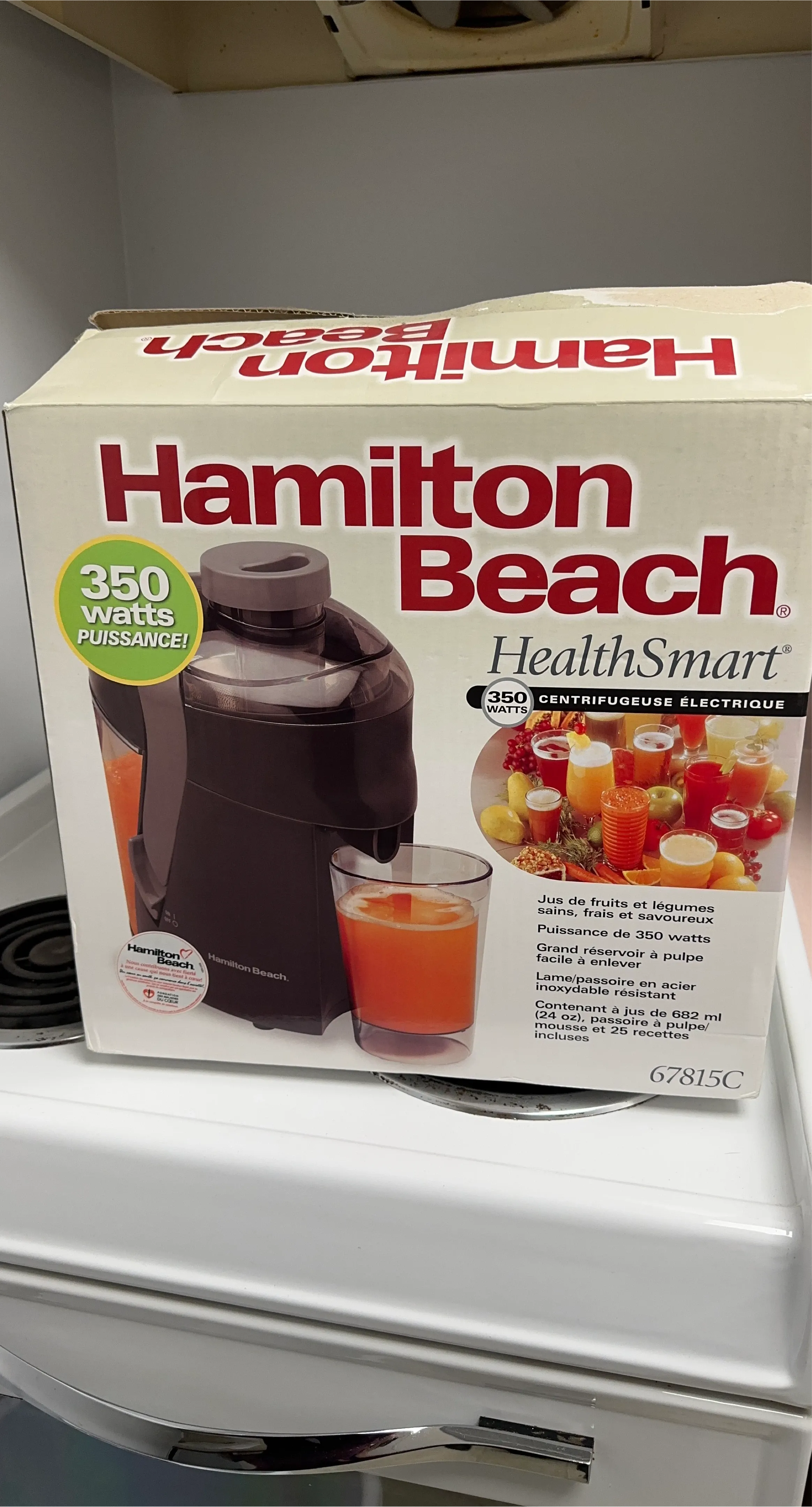 Selling a Hamilton Beach HealthSmart juicer! It's a 350-watt electric juicer for fruits and veggies. Comes with a large pulp container that's easy to remove, and a durable stainless steel blade/strainer. Includes a juice container of 682 ml (24 oz), a pulp/foam strainer, and 25 recipes! The box is included
