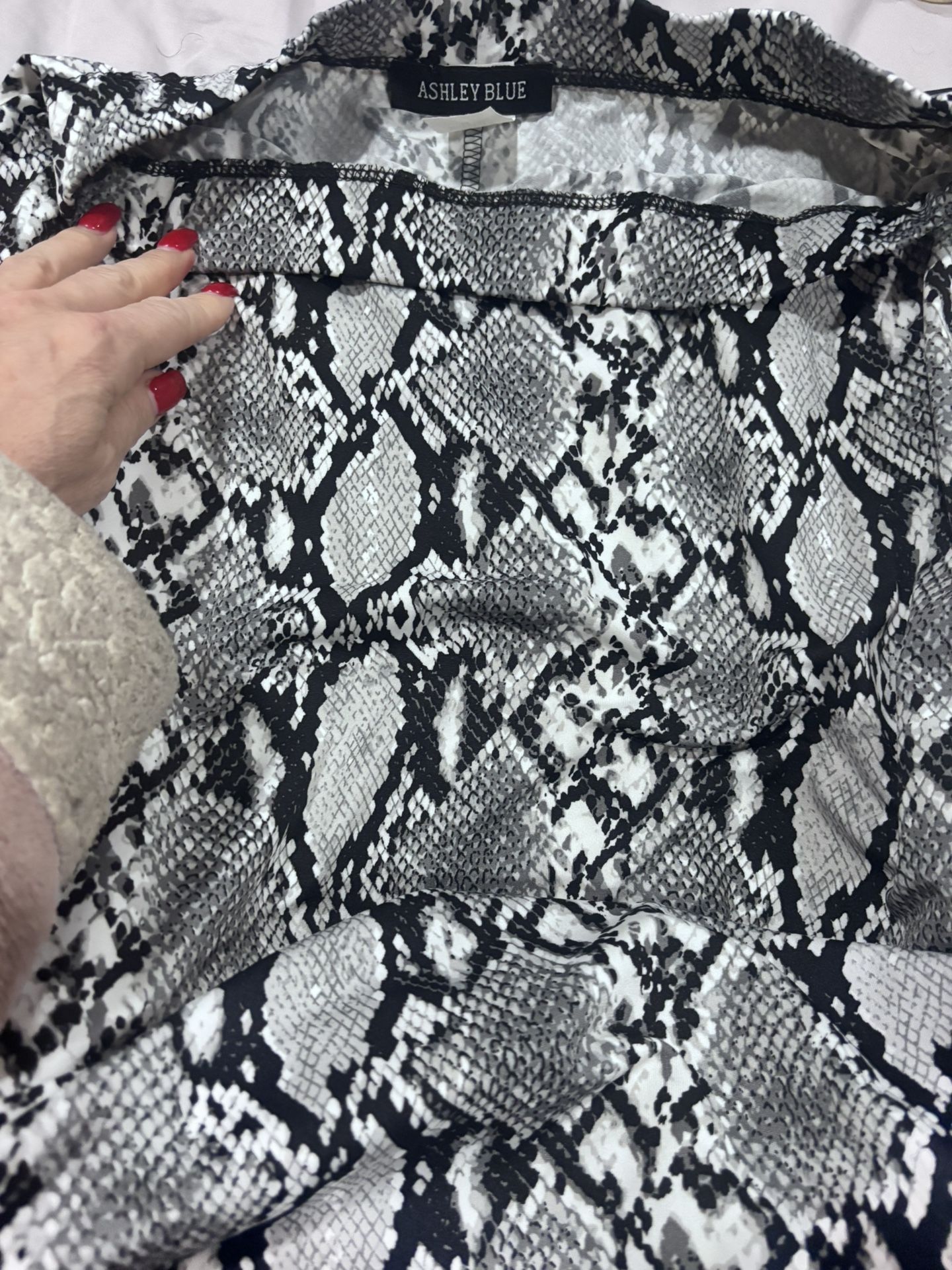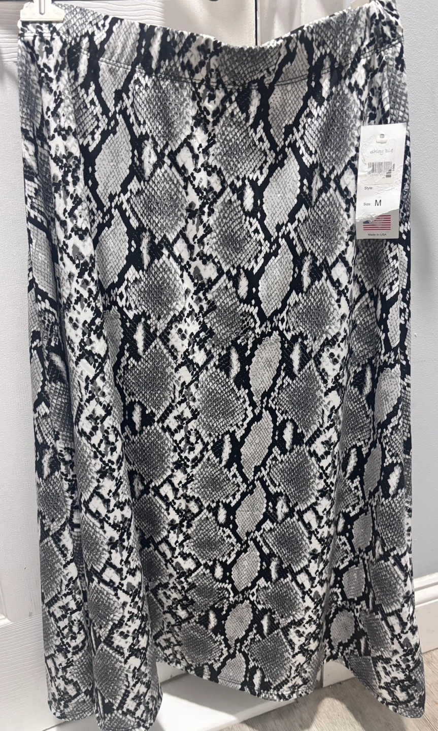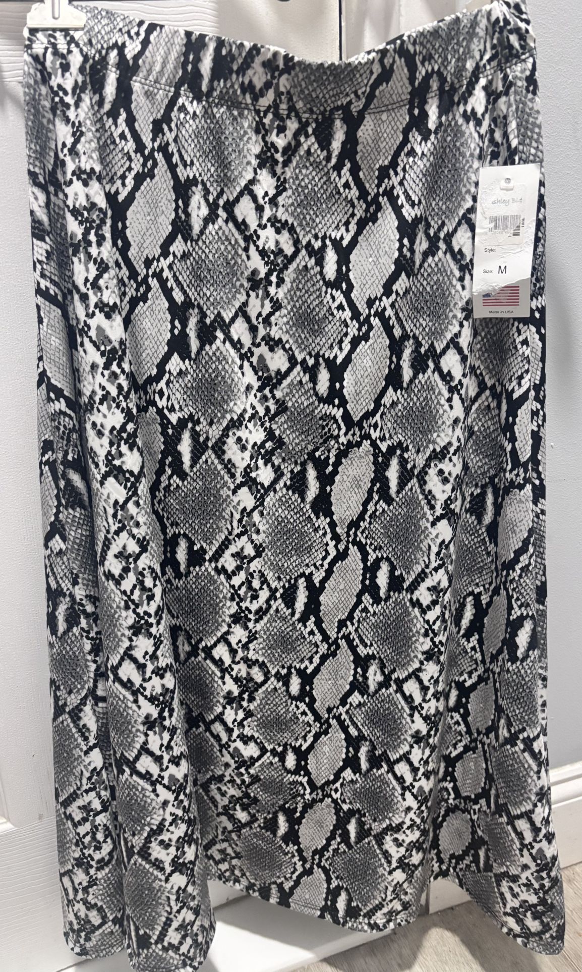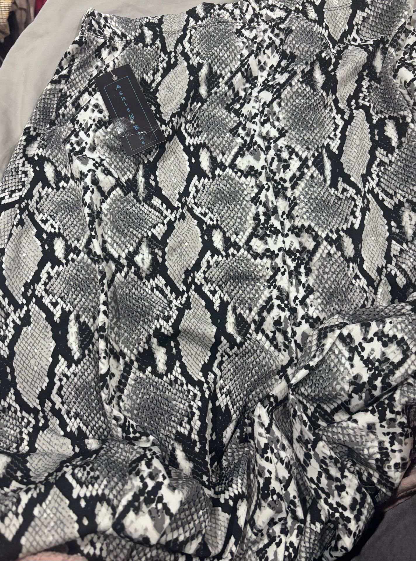 Ashley Blue snake-print midi skirt in a size Medium. Featuring a bold black, grey, and white snakeskin pattern, this skirt gives a chic, edgy look while still being easy to style. The fabric has a soft, smooth drape that flatters the body and moves beautifully.