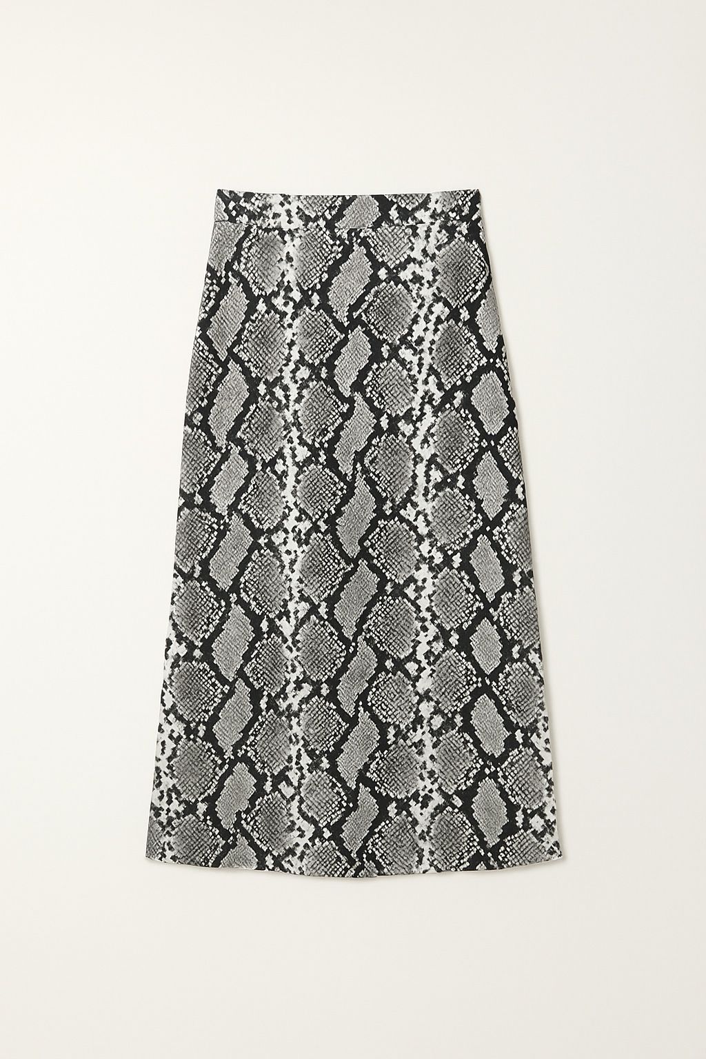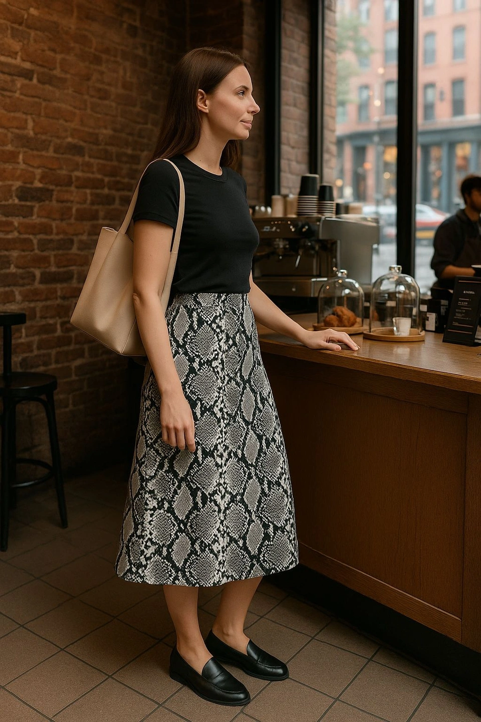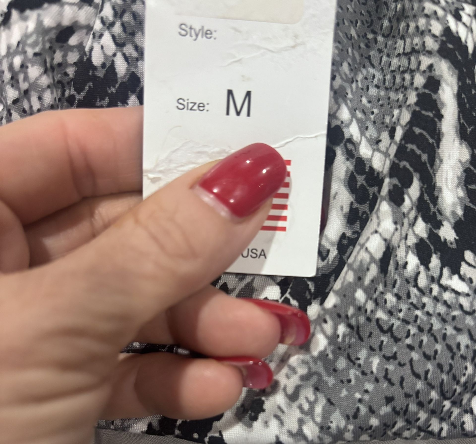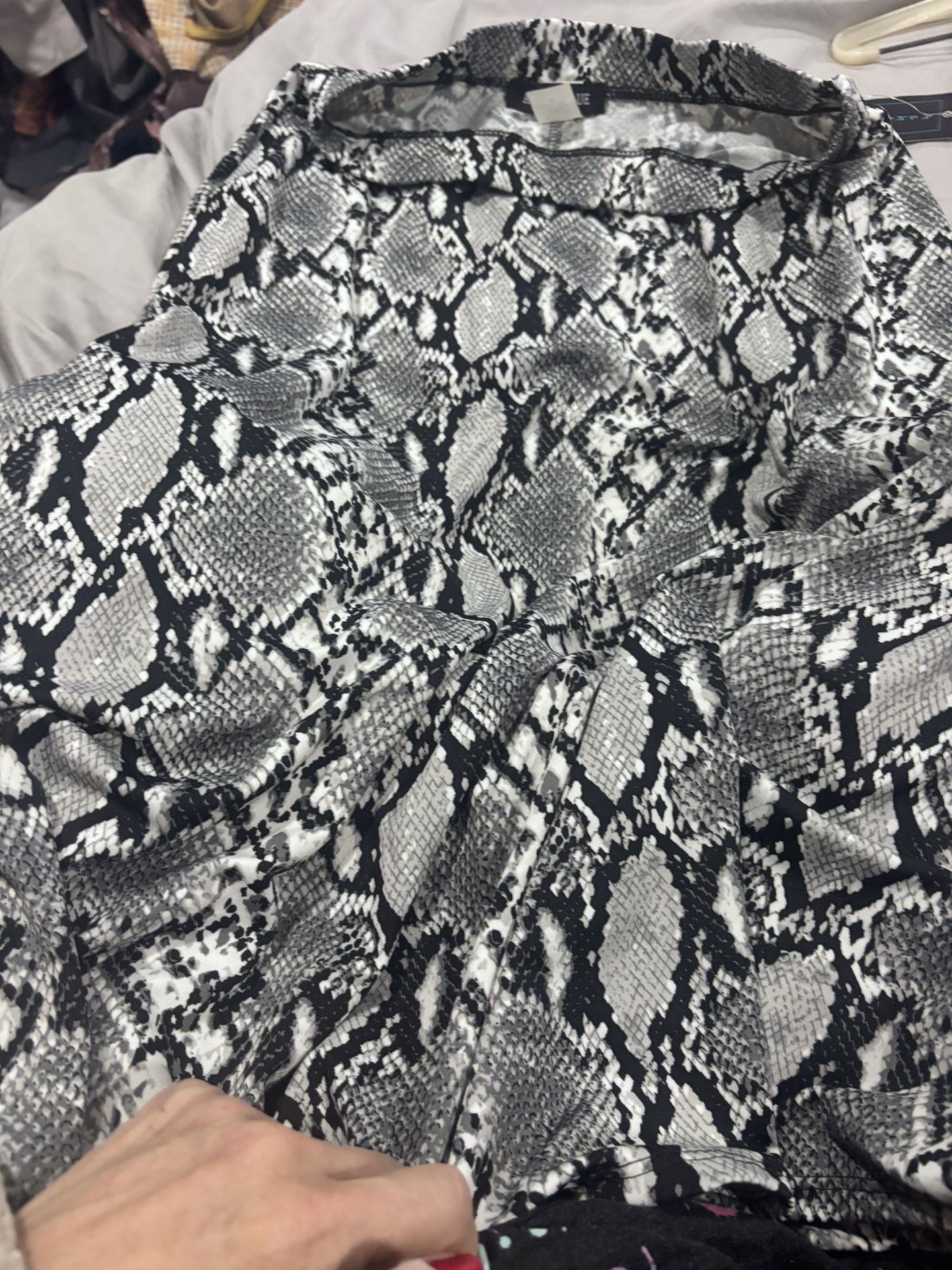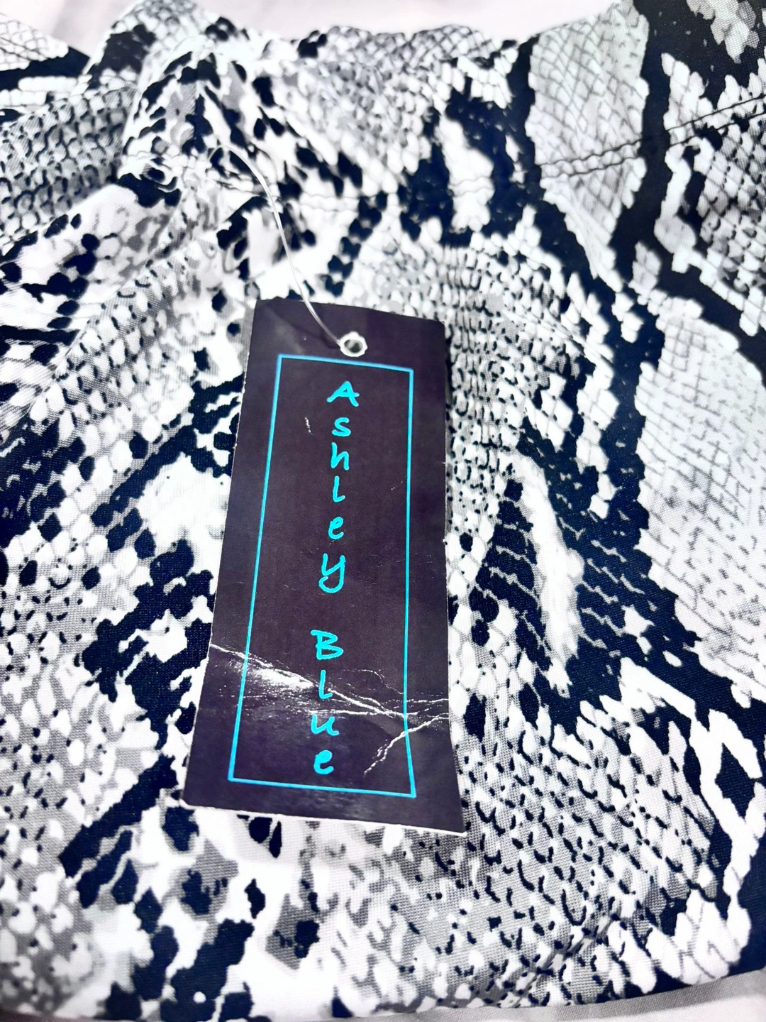 Ashley Blue snake-print midi skirt in a size Medium. Featuring a bold black, grey, and white snakeskin pattern, this skirt gives a chic, edgy look while still being easy to style. The fabric has a soft, smooth drape that flatters the body and moves beautifully.