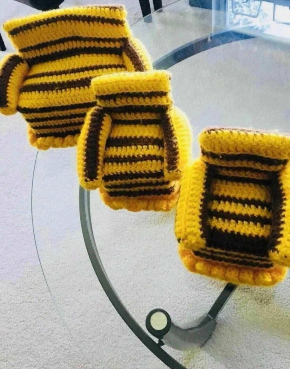 Adorable set of 3 chairs, crocheted in yellow and brown yarn. Perfect for dollhouses or home décor.