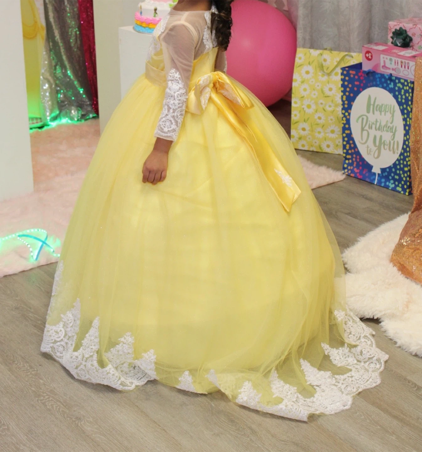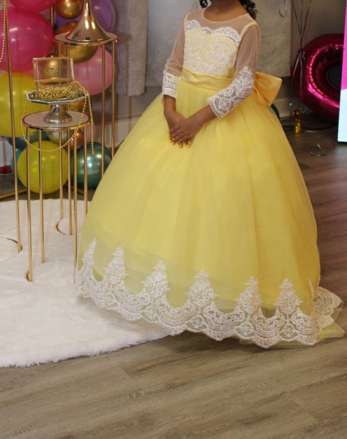 Beautiful yellow princess dress, perfect for parties or special occasions! It features a full skirt with delicate white lace trim and a matching yellow sash. The dress has long sleeves with lace detailing, adding a touch of elegance. It's in great condition and ready to make someone feel like royalty