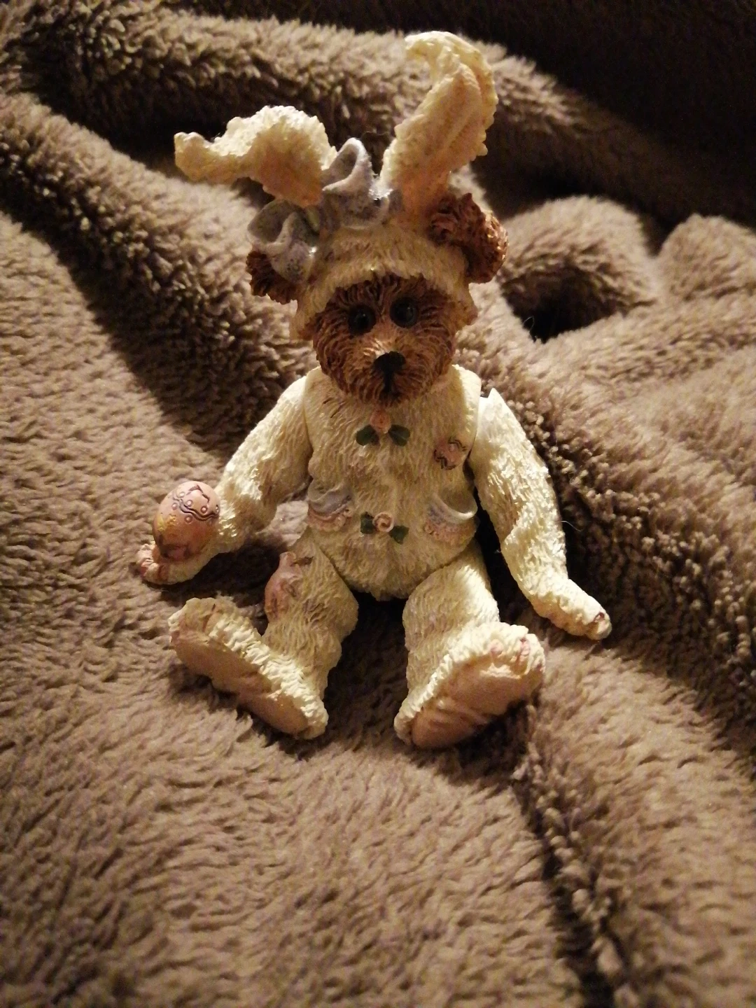 Here's a cute Boyds Bears figurine dressed in an Easter bunny outfit! It's holding a little egg, perfect for adding a touch of spring to your decor