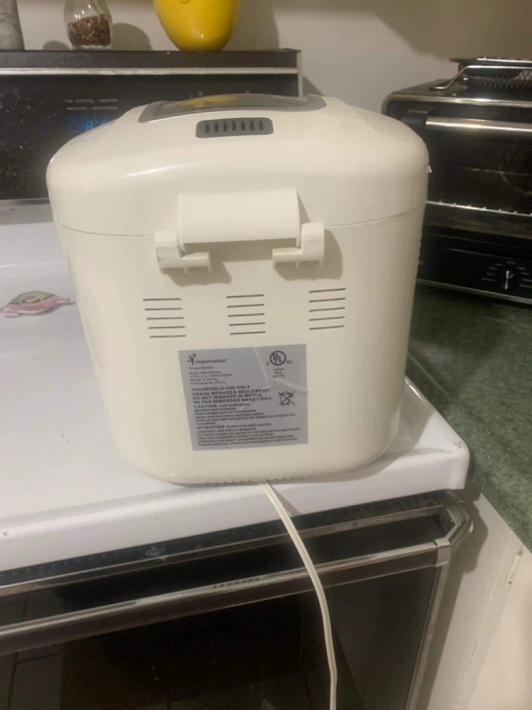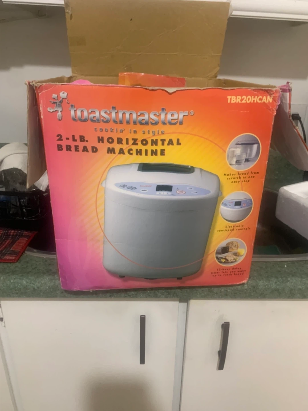 Selling a Toastmaster 2-LB Horizontal Bread Machine, model TBR20HCAN. It comes with the box. Perfect for making fresh bread at home!