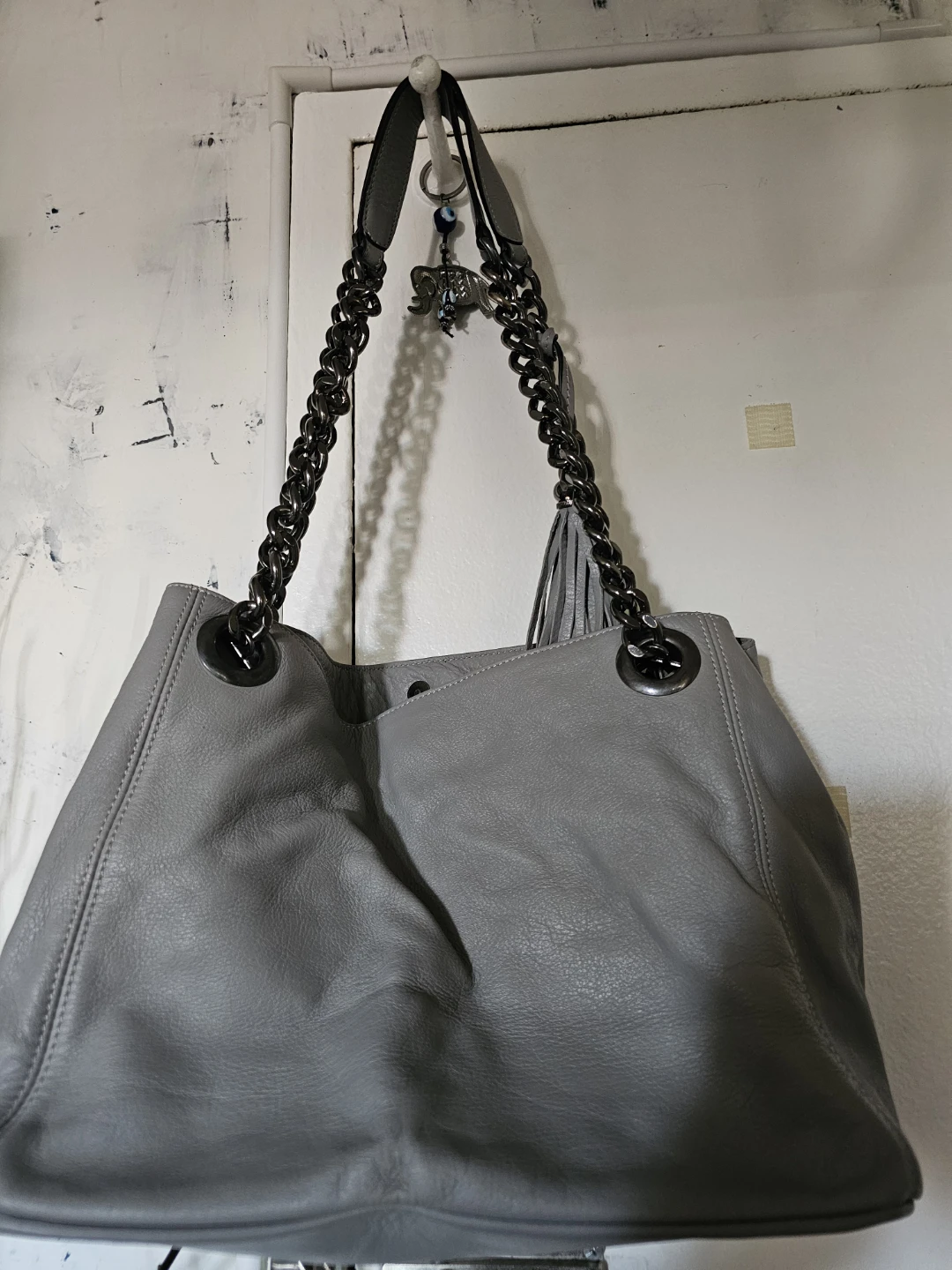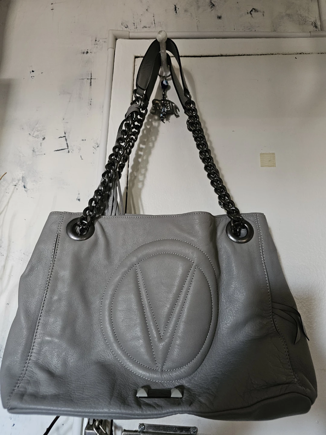 Selling a stylish Valentino shoulder bag in a beautiful gray leather. It features a chain strap and a distinctive 'V' logo design. This bag is perfect for adding a touch of elegance to any outfit!