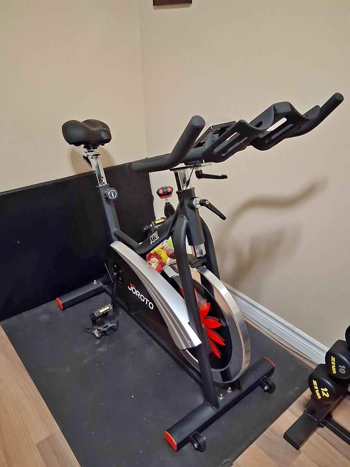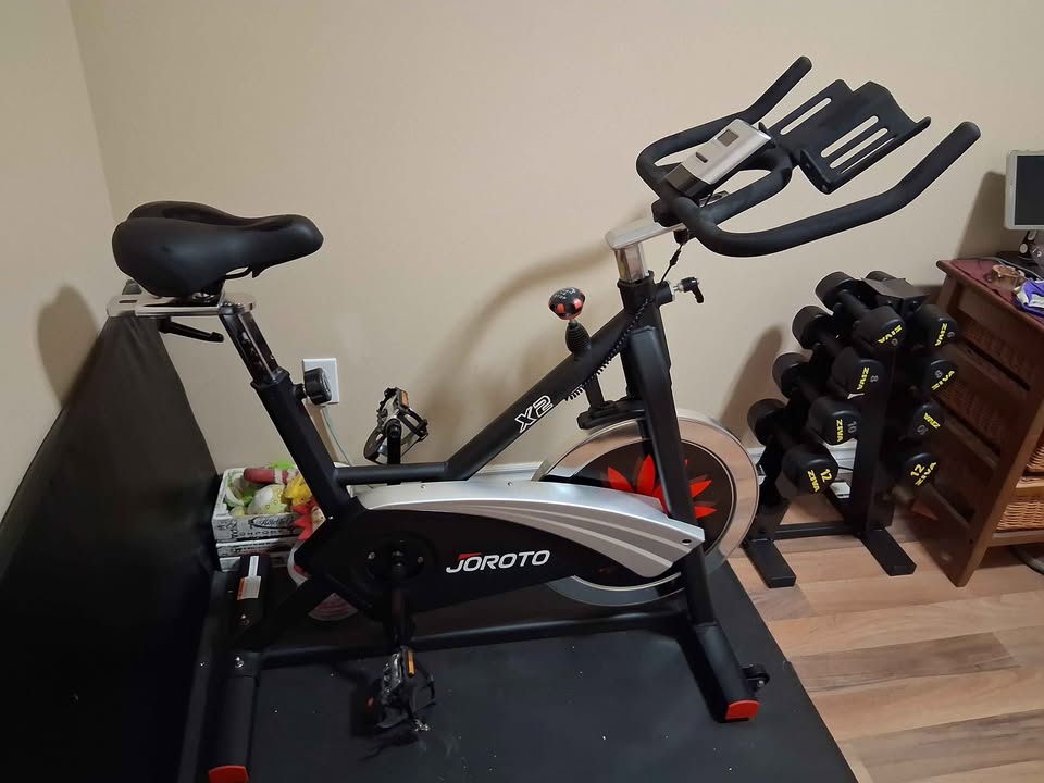 Like new Joroto X2 spin bike. Adjustable-height seat and handlebars. Magnetic resistance (silent). Display uses 2 AA batteries. Holds a tablet or water bottles on the handlebars. Purchased in 2022. Includes manual.
