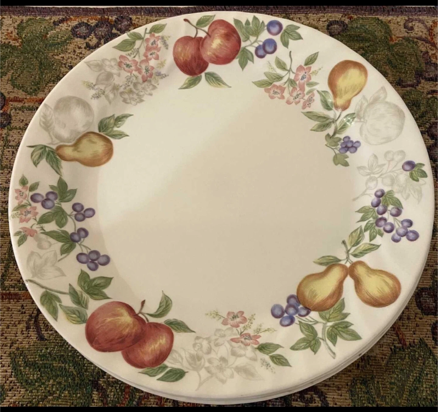 Selling a set of dinner plates featuring a lovely fruit design with apples, pears, and blueberries. They would be a great addition to any kitchen to add to your collection.