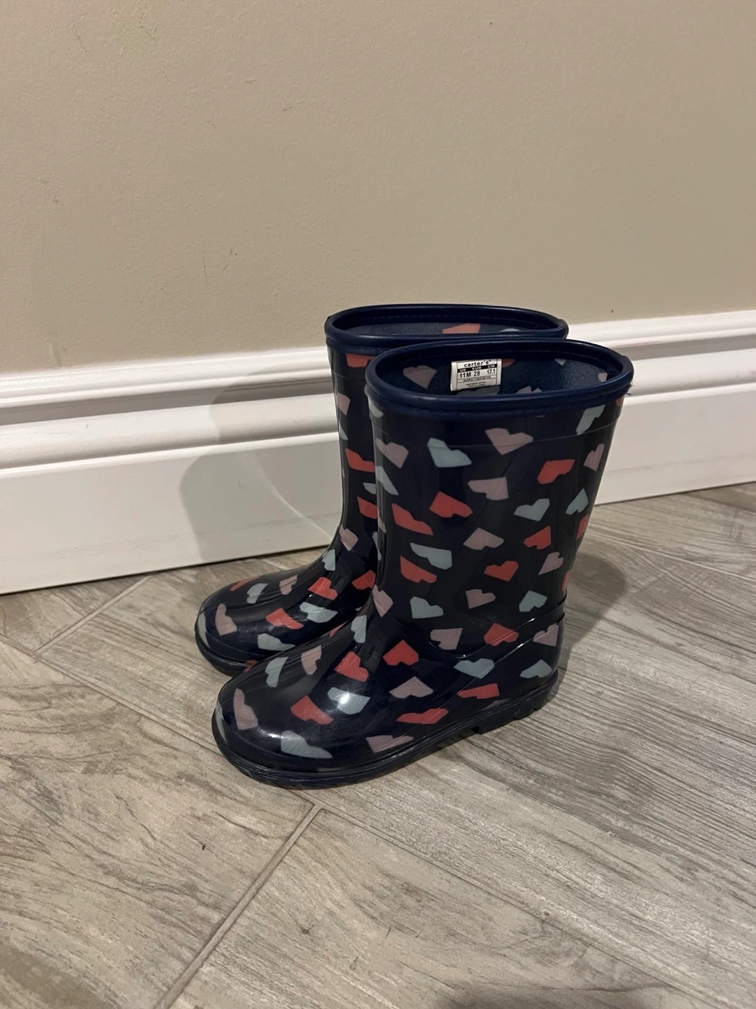 These Carter's rain boots are perfect for keeping your little one's feet dry and stylish! They feature a fun heart pattern and are in great condition. The size is 11M.