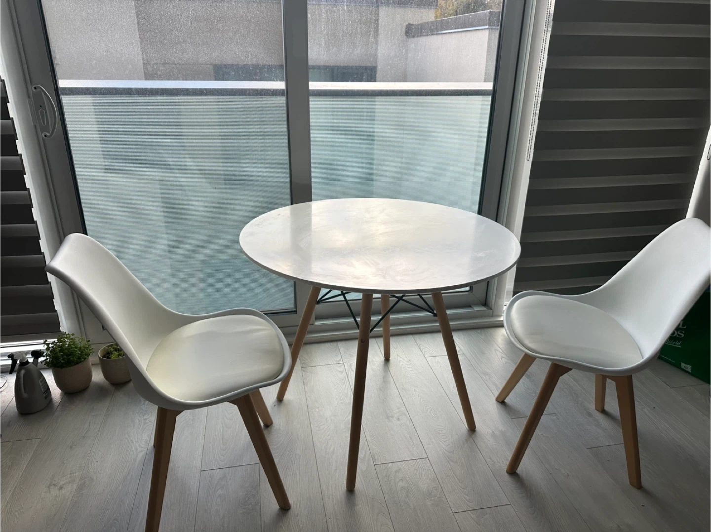 Selling a cute round dining table with two matching chairs. The set is in great condition and would be perfect for a small apartment or breakfast nook. The chairs have a comfortable seat and a modern design. The table has wooden legs