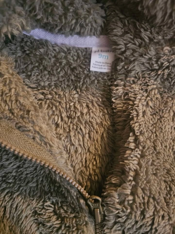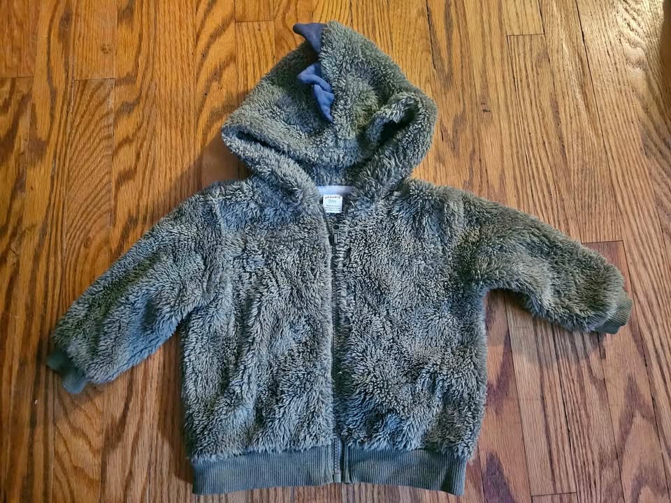 Very warm dark green soft jacket like sweater. Sherpa material, Has a dino hood that would be perfect as a Halloween costume option.