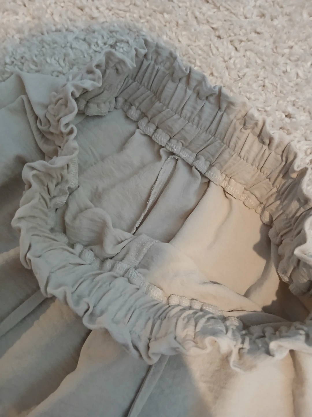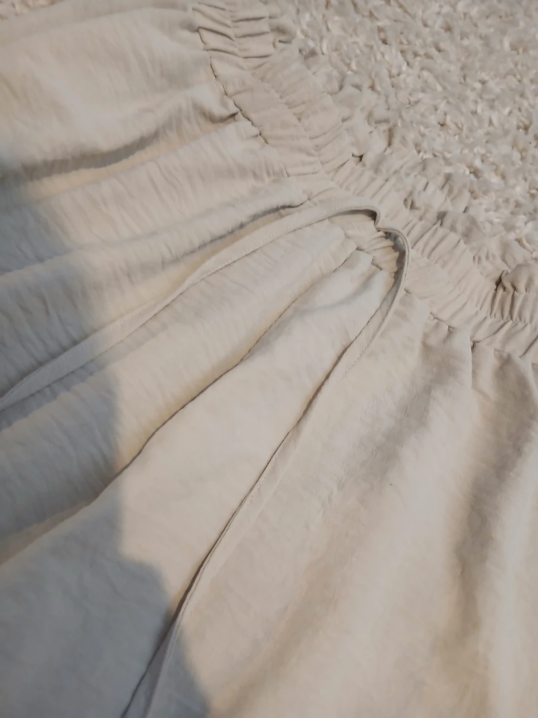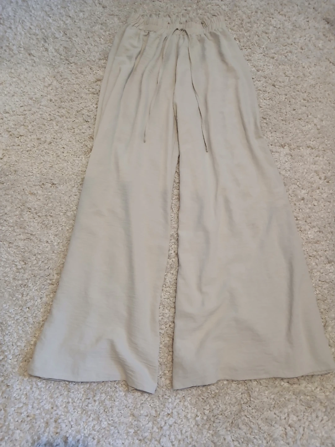 Selling a pair of beige wide-leg pants. They feature an elastic waistband with a drawstring. Perfect for a relaxed and comfortable fit. From Cupshe