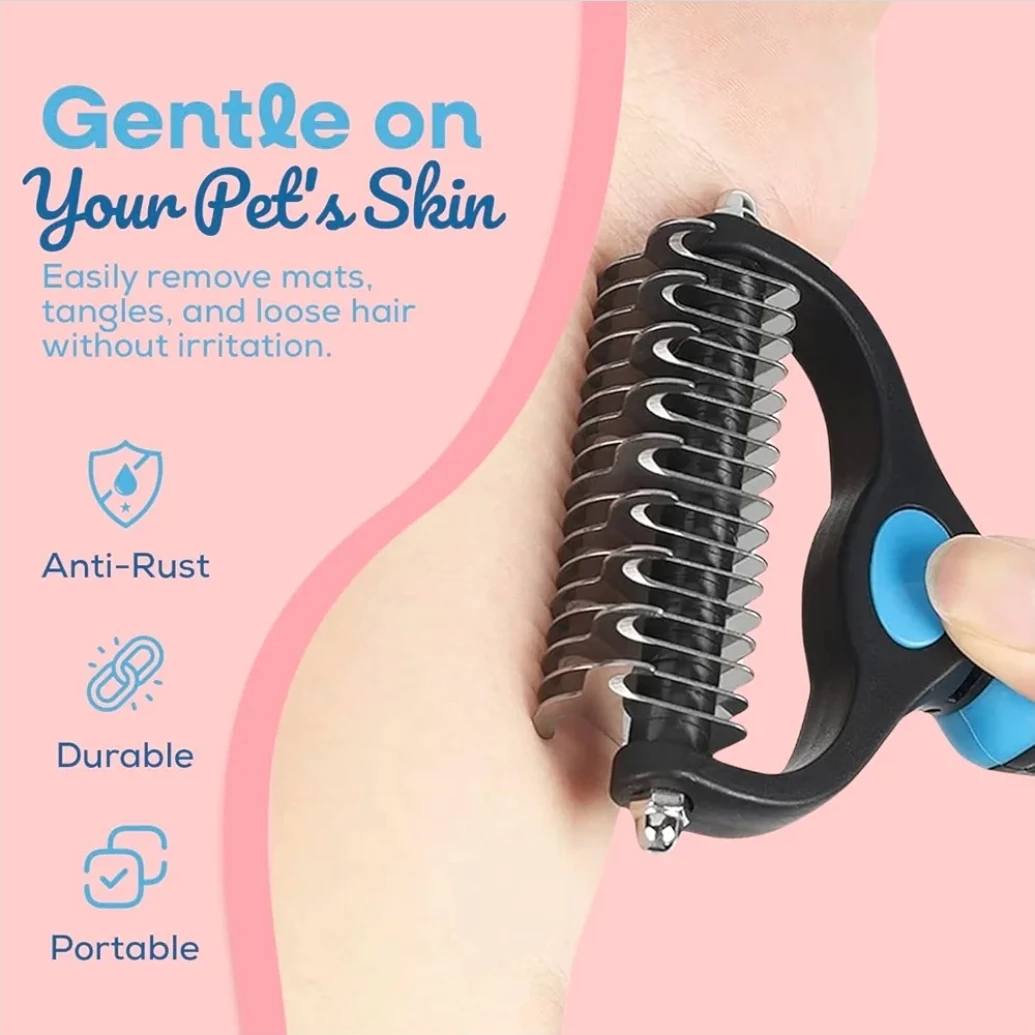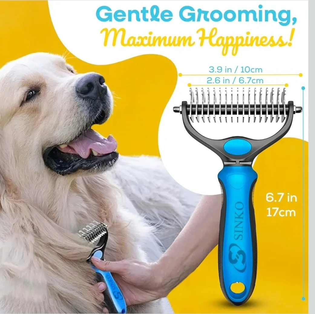 Keep your furry friends looking their best with this SINKO undercoat rake! It's great for detangling, deshedding, brushing, and removing shed fur, knots, mats, and tangles. The extra-wide, double-sided stainless steel teeth make grooming a breeze. Itโs also durable, anti-rust and portable