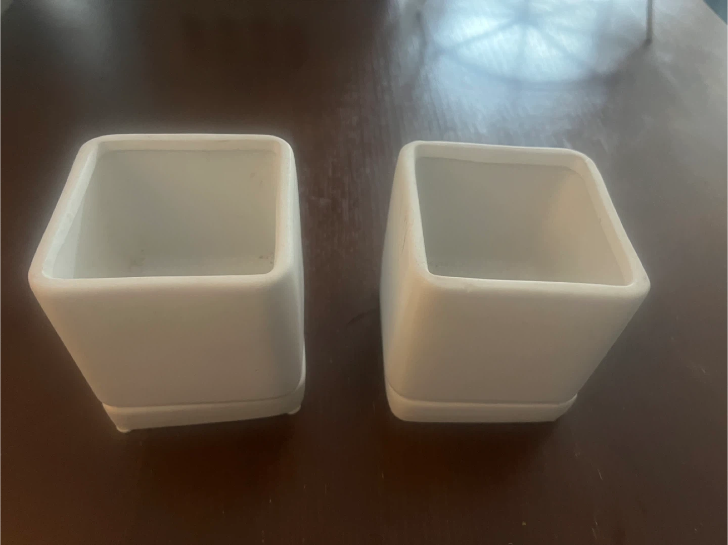 Selling a pair of square ceramic flower pots, perfect for adding a touch of modern simplicity to your indoor plants. They come with matching trays to catch any excess water. They are in good condition and ready for a new home!