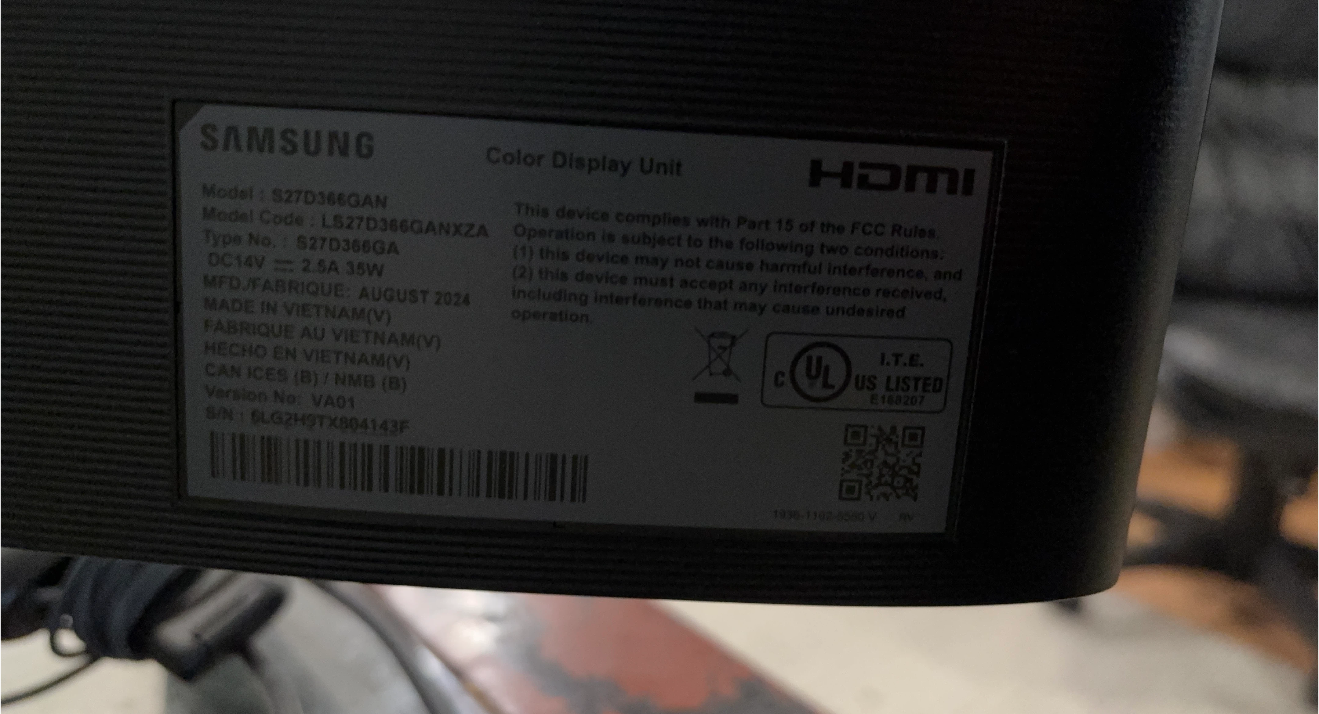 Selling a Samsung S27D366 curved monitor in great condition! The model code is LS27D366GANXZA. It's a color display unit made in Vietnam. The manufacturing date is August 2024. Feel free to reach out with any questions!