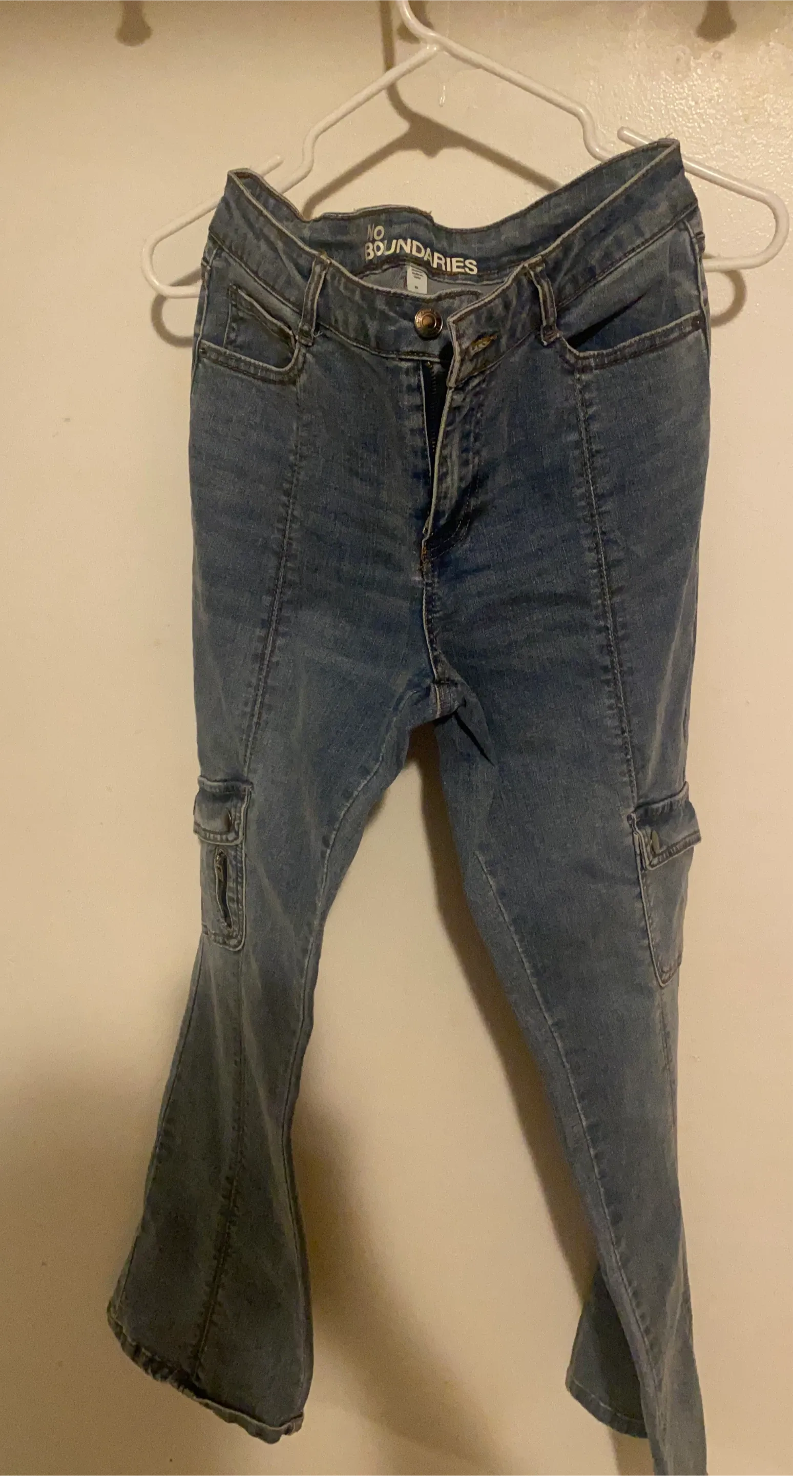 Jeans from No Boundaries in a size 10. They are blue and have a unique design with cargo pockets. They're in good condition and ready for a new home