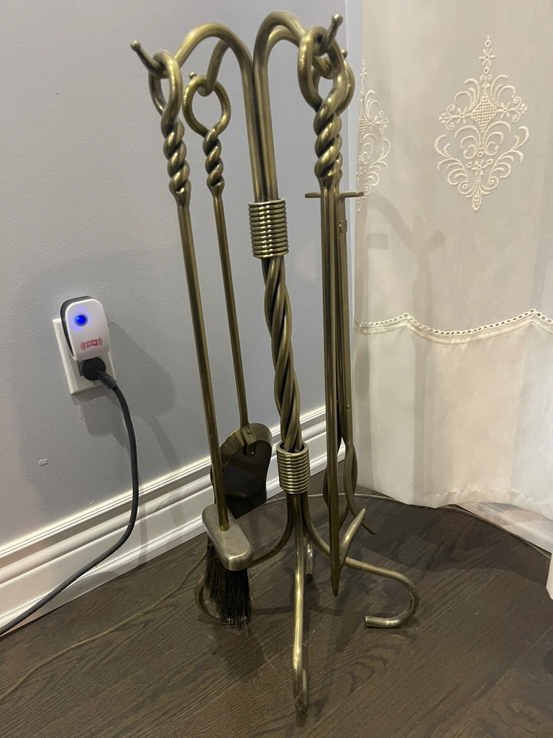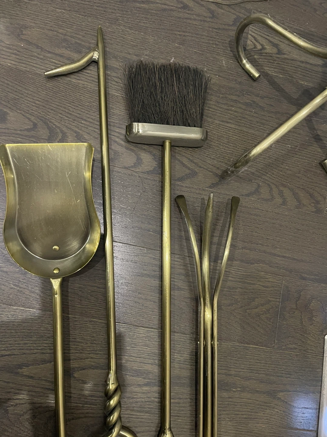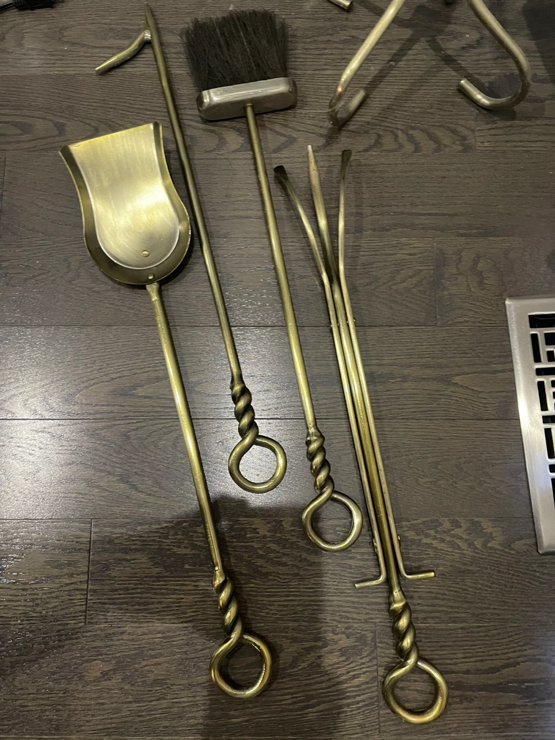 Selling a beautiful antique brass fireplace tool set. It comes with a stand, shovel, poker, brush, and tongs. Heavy and well-constructed.