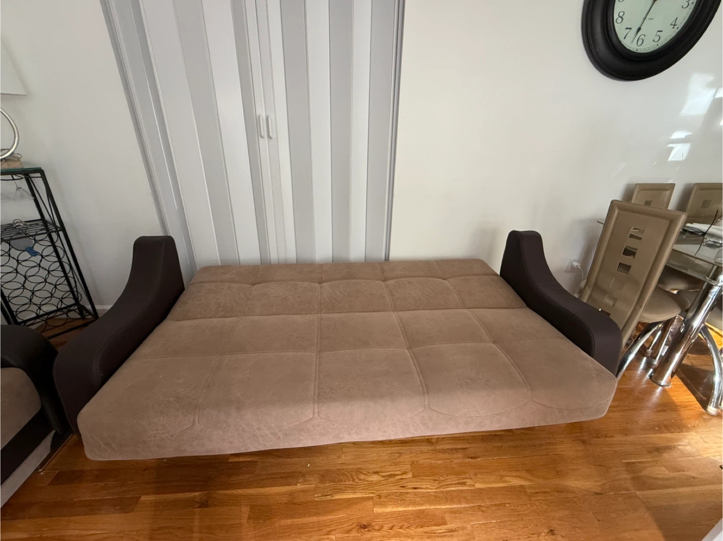 Selling a sofa bed set in brown tones. It's in good condition and ready for a new home! The set includes a sofa and a matching ottoman that can be used as an extension to the sofa bed or as a separate seating area. Perfect for small spaces or guest rooms!